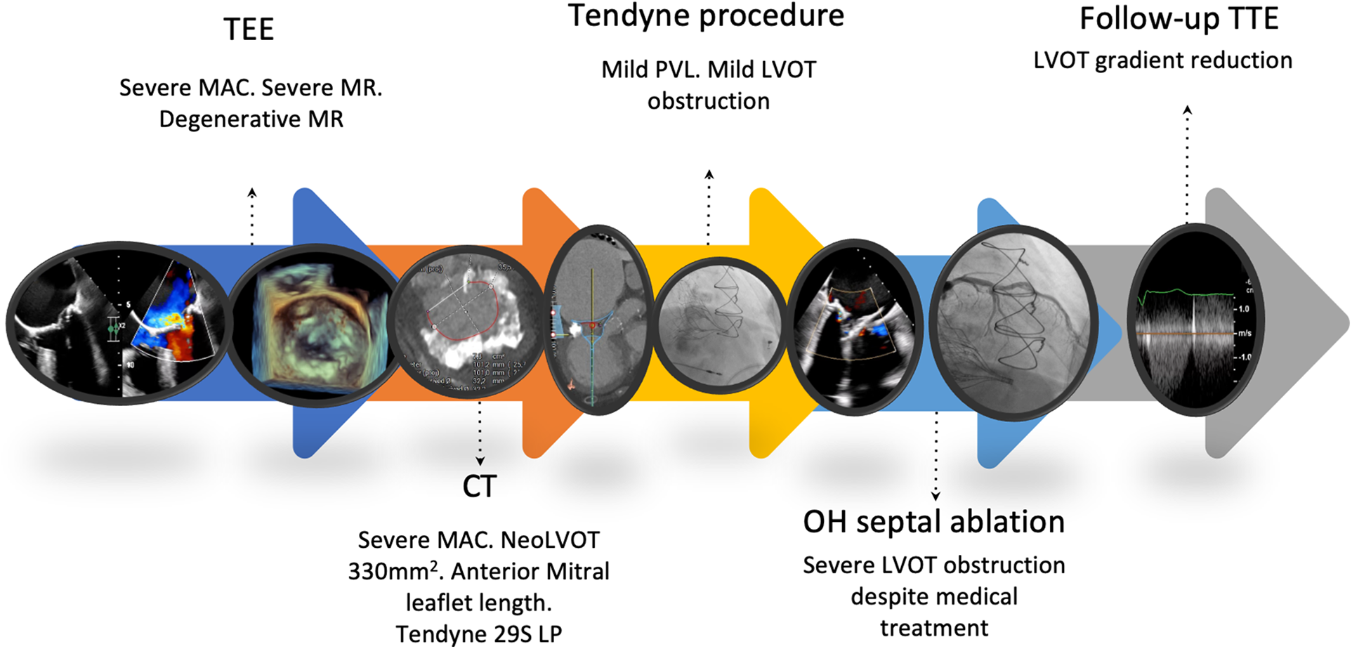 Days after the procedure, the patient exhibited poor AF rate control and HF. Transthoracic echocardiography (TTE) showed LVOTO due to contact between the Tendyne medial frame and the septal wall (Supplementary Video 4), with an initial pressure gradient of 45 mmHg. Medical treatment for the LVOTO was initially established. Beta-blockers were up-titrated according to the clinical symptoms and tolerance. The patient improved, and TTE was performed, with an LVOT gradient of 35 mmHg before discharge. However, the patient was re-admitted with HF symptoms 18 days after discharge and repeated severe LVOTO (45 mmHg was noted on TTE). After carefully reviewing the patient's history, the heart team agreed to first implant a pacemaker, and then perform alcohol septal ablation (ASA) with a 1.25 mm over-the-wire balloon in the second septal perforation artery (Supplementary Video 5). Control TTE performed 7 weeks after ASA showed a LVOT gradient of 12 mmHg (Supplementary Figure 3). At present, 6 months after the procedure, the patient presents NYHA functional class II, without signs of HF and with no further hospital admissions (Figure 1).