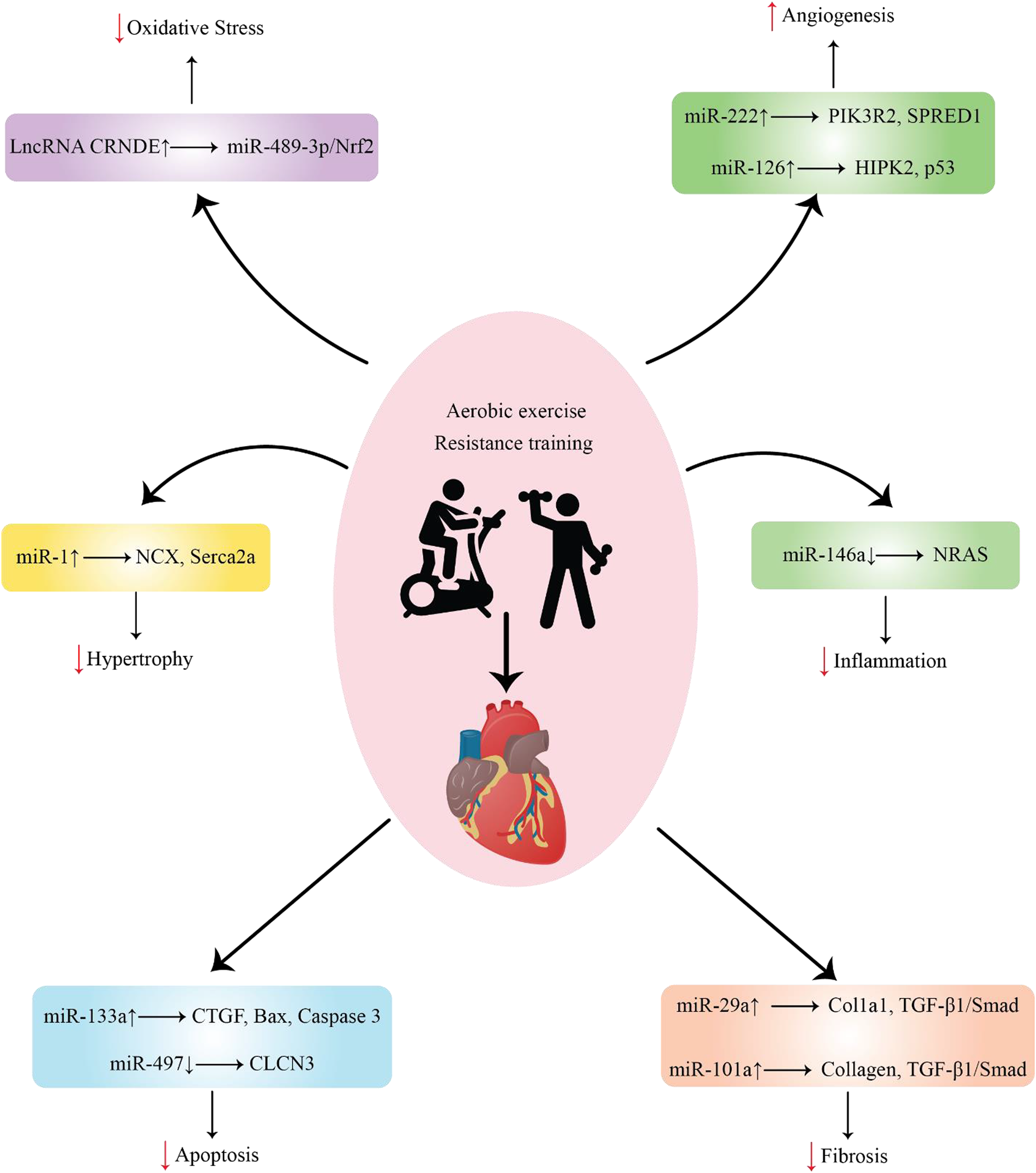 It is commonly known that some miRNAs are controlled in hypoxic environments. Increased angiogenesis in the heart has been linked to the overexpression of certain miRNAs, including miR-126 and miR-222, when exercise is performed (Figure 1). This can lessen the chance of ischemia and the ensuing myocardial infarction by increasing blood flow and oxygen delivery to heart tissues (Table 1).