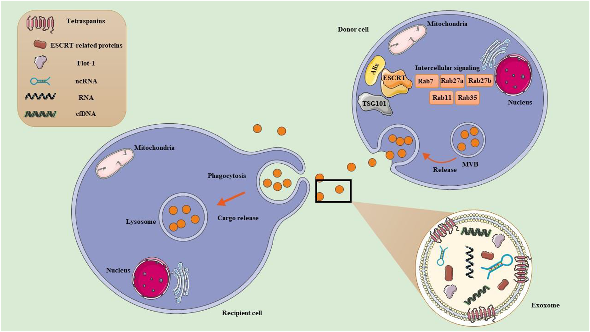 As part of normal and abnormal processes, almost all cells can release exosome. Exosome biogenesis often occurs with the endocytosis of extracellular materials, which generate early endosomes. Early endosomes ultimately develop into late endosomes through interactions with various intracellular vesicles and organelles, such as the Golgi complex and endoplasmic reticulum. The continuous inward folding of the membrane in late endosomes contributes to the generation of MVBs, which efficiently transport exosomes. MVBs are directed toward and integrate with the plasma membrane through collaboration with the Rab family of GTPase proteins, which ultimately discharge exosomes into the extracellular milieu (122). The exosomes are released from the donor cell when they are discharged and either fuse with the plasma membrane or are absorbed by the destination cells (21). Thus, they have an impact on regulating recipient cells' physiological and pathological responses (123). Exosomes in biological fluids can offer a window into altered cellular or tissue states in various diseases, potentially serving as multimodal diagnostic readouts.