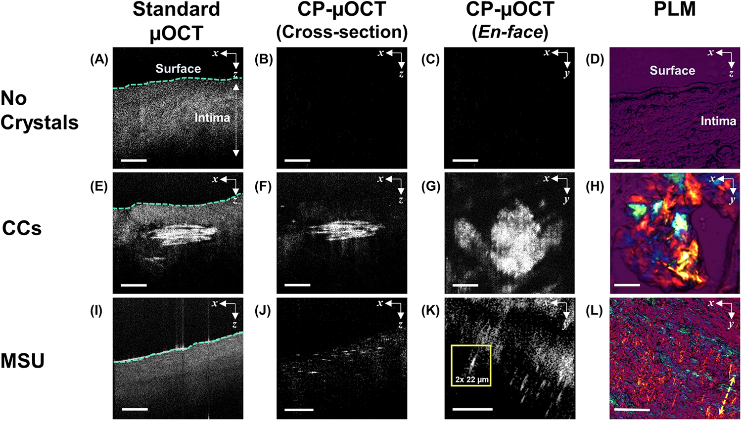 Histological validation of microscopic crystals identification from CP-µOCT images. (A–D) Standard µOCT, cross sectional and en-face CP-µOCT and PLM images of fresh healthy human cadaver coronary arteries with no crystalline structures, (E–H) with accumulated CCs and (I–L) with needle-shaped crystals suggestive of MSU. The en-face CP-µOCT image shows the difference between sheet-shaped and needle-shaped crystals corresponding to MSU and CCs, respectively (G,K). The inset in (K) shows the size of an individual MSU crystal. Yellow double arrow indicates slow axis in PLM (L). Scale bars, 100 µm (A–D,I–L); 50 µm (E–H). CC, cholesterol crystal; CP-µOCT, cross-polarized micro-optical coherence tomography; MSU, monosodium urate; PLM, polarized light microscopy.