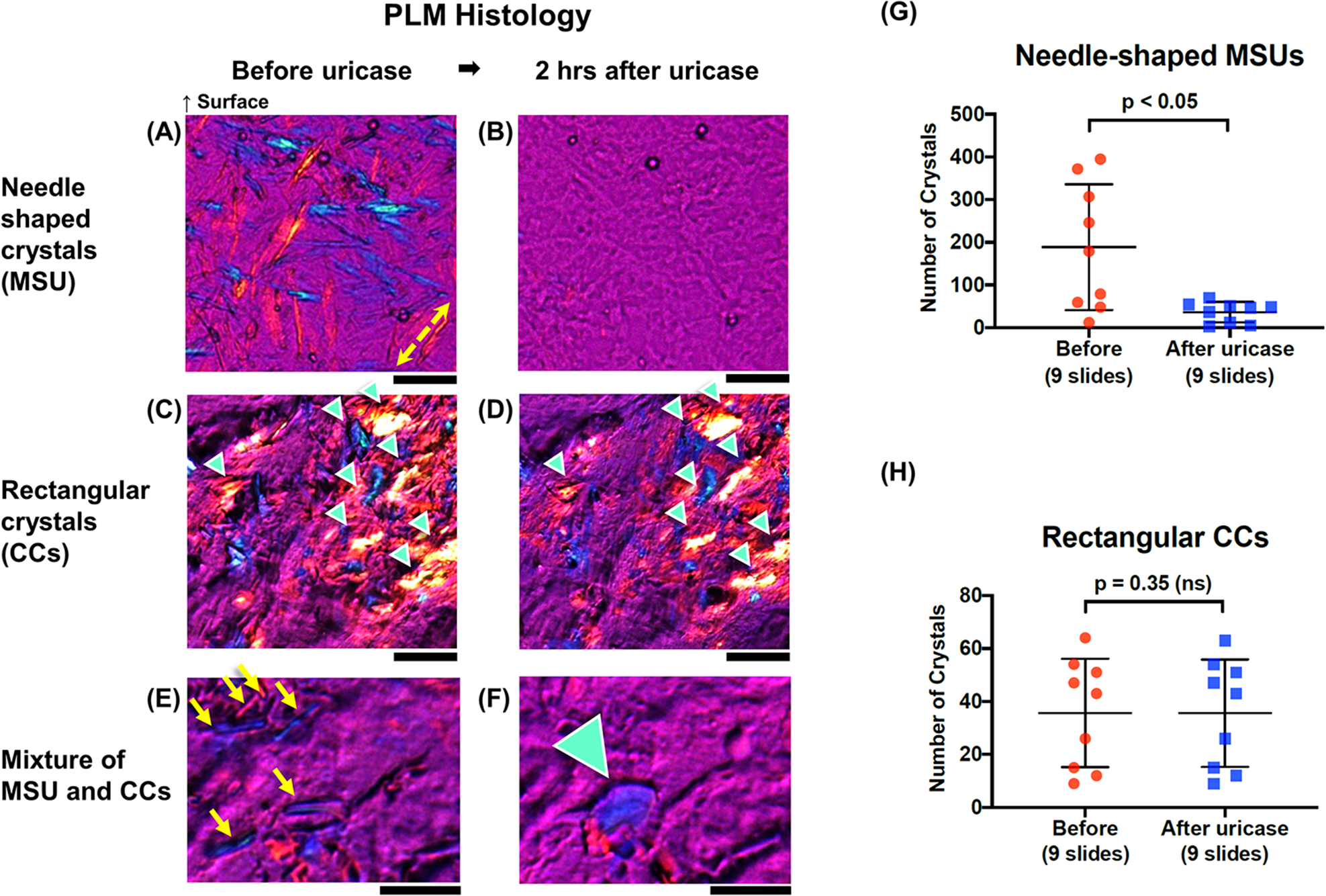 To examine whether needle-shaped structures were MSU, 9 representative unstained slides were selected and immersed in uricase (U9375, Sigma-Aldrich, St. Louis, Missouri), an enzyme that specifically degrades uric acid to 5-hydroxylisourate, and incubated at 37℃ for 2 h (Figure 2).