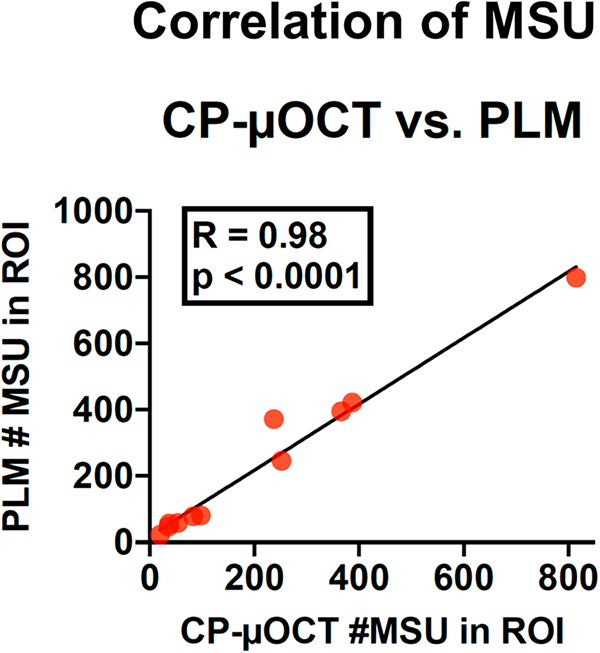 Correlation of MSU counted by CP-µOCT vs. PLM. Eleven CP-µOCT ROIs of 750 (x) × 1,000 (y) × 400 µm (z) and matching PLM slides (40× magnification, slides with 750 (x) × 400 µm (z) field of view) were chosen for the analysis. ROI, region of interest; other abbreviations as in Figure 1.
