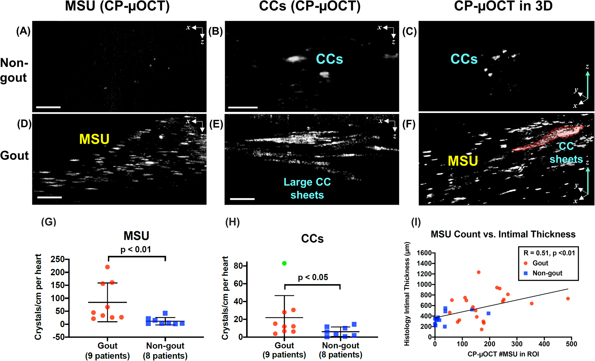 Human cadaver coronary arteries with a history of CAD with or without gout were dissected for CP-µOCT imaging. Specimens were processed for histological identification of birefringence under polarization light microscopy (PLM). CP-µOCT visualized needle-crystals that appeared as long projections in orthogonal planes, and PLM confirmed that CP-µOCT-delineated needle-crystals demonstrated negative birefringence. The needle-crystals were dissolved after immersion in uricase (p < 0.05), and thus were MSU. CP-µOCT was three-dimensionally volume-rendered for counting MSU and CCs in 79 regions of interest sized [750 (x) × 500 (y) × 400 (z) µm]. Crystal counts were normalized by the total coronary length utilized. The relationship between CP-µOCT-delineated MSU counts and those seen in corresponding histology, and the difference in coronary MSU amongst gout vs. non-gout patients was analyzed. CP-µOCT-delineated MSU counts were significantly correlated with MSU counted by PLM-based histology (R = 0.98, p < 0.01), and with histology-derived intimal thickening (R = 0.51, p < 0.01). MSU and CCs were both significantly greater in gout patients compared with non-gout patients (p < 0.05).