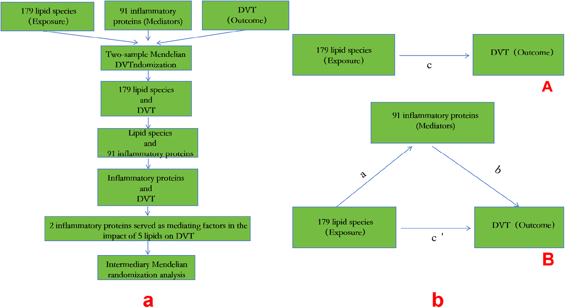 A: MR process; b: (A) the total effect between lipid species and DVT.c is the total effect using genetically predicted lipid species as exposure and DVT as outcome. d is the total effect using genetically predicted DVT asexposure and lipid species as outcome. (B) The total effect was decomposed into: (i) indirect effect using a two-step approach (where a is the total effect of lipid species on inflammatory proteins, and b is the effect of inflammatory proteins on DVT)and the product method (a × b) and (ii) direct effect (c′ = c – a × b). Proportion mediated wasthe indirect effect divided by the total effect.
