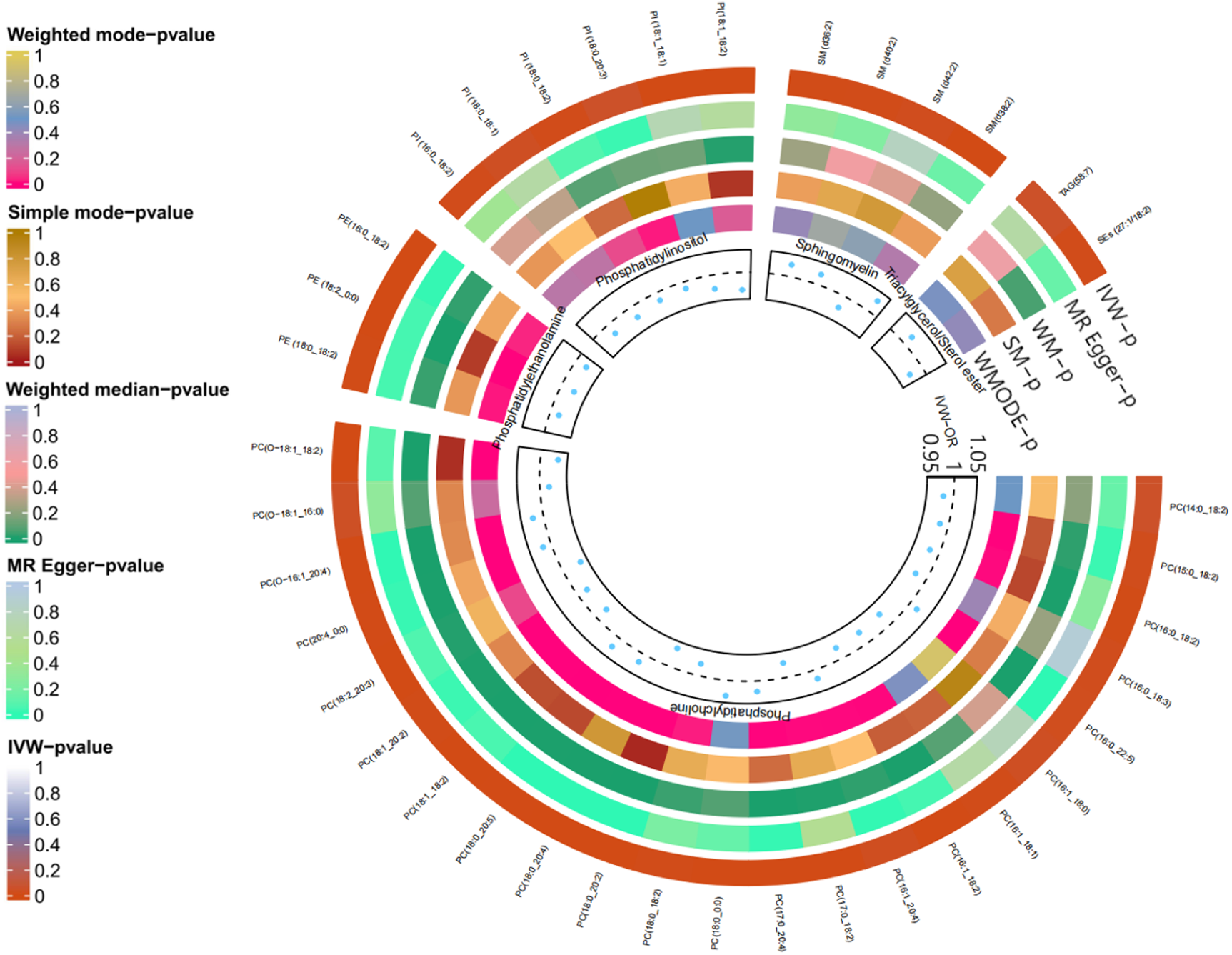 As anticipated, we observed significant genetic associations with DVT for 38 out of 179 lipid species (P < 0.05). Specifically, there were 23 phosphatidylcholine (PC), 6 phosphatidylinositol (PI), 4 sphingomyelin (SM), and 3 phosphatidylethanolamine (PE) species identified as associated with DVT risk. Additionally, one sterol ester (SEs) and one triacylglycerol (TAG) exhibited significant associations, while the remaining lipid species were excluded from further analysis; please refer to Figure 2 for detailed information.