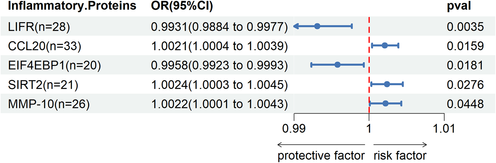 Through two-sample MR Cycling, we identified a significant genetic association (P < 0.05) between five inflammatory proteins and DVT. Among these proteins, Leukemia inhibitory factor receptor (LIFR) and Eukaryotic translation initiation factor 4E-binding protein 1 (EIF4EBP1) were found to exert a protective effect against DVT, while C-C motif chemokine 20 (CCL20), SIR2-like protein 2 (SIRT2), and Matrix metalloproteinase-10 (MMP-10) were identified as risk factors for DVT.Please refer to Figure 3 for detailed information.