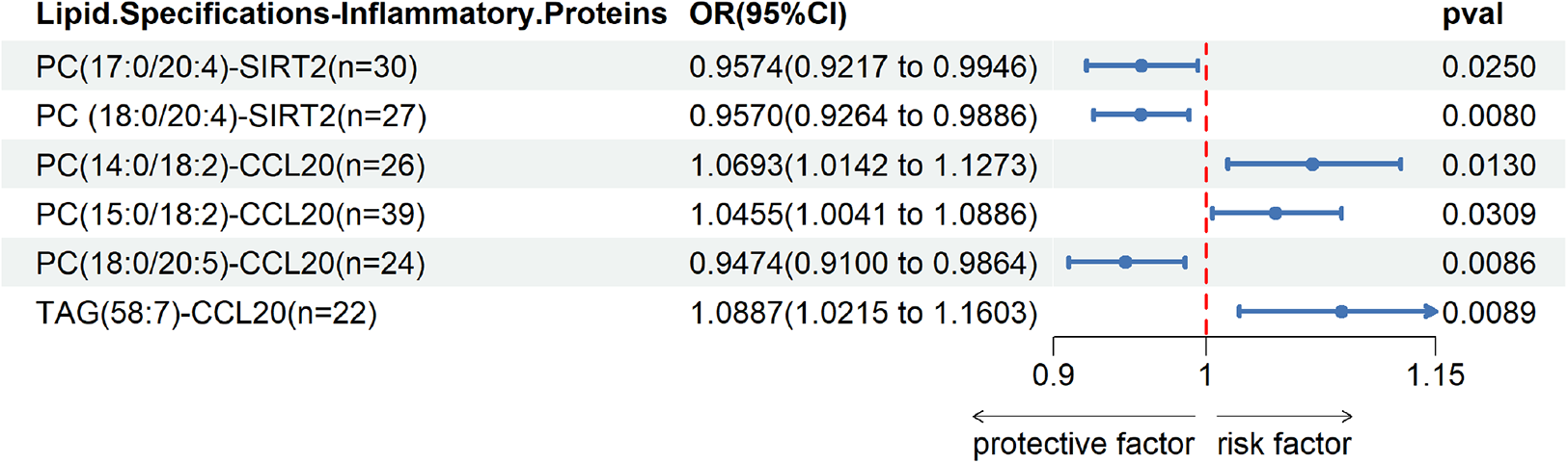We observed cycling between 38 lipid species and 5 inflammatory proteins in two samples. Significant correlations were found between PC(17:0/20:4) and SIRT2, PC(18:0/20:4) and SIRT2, PC(14:0/18:2) and CCL20, PC(15:0/18:2) and CCL20, PC(18:0/20:5) and CCL20, as well as TAG(58:7) and CCL20 Union; the remaining associations were not statistically significant.Please refer to Figure 4 for detailed information.