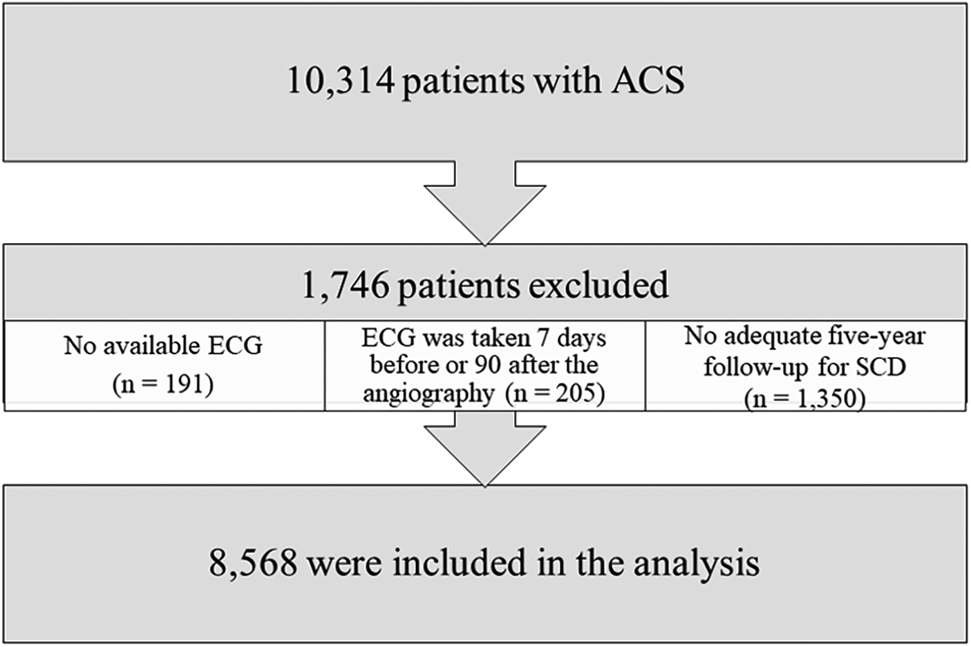 Out of all 10,314 consecutive patients undergoing angiography for ACS, patients with no electronic ECG available (n = 191) and those for whom the ECG was recorded more than 7 days prior to, or over 90 days after, the angiography (n = 205) were excluded. Finally, as follow-up time was limited to 5 years (last follow-up date Dec 31, 2021), patients without adequate five-year follow-up data for SCD were excluded (n = 1,350; this criterion applies to patients treated between 2017 and 2018 who were alive at the end of the follow-up). After exclusions, 8,568 patients were available for analysis. The majority (n = 8,239, 96.2%) of the ECGs were recorded on the same day, as or within 1 week after, the angiography. A flowchart of the patient selection is presented in Figure 1.
