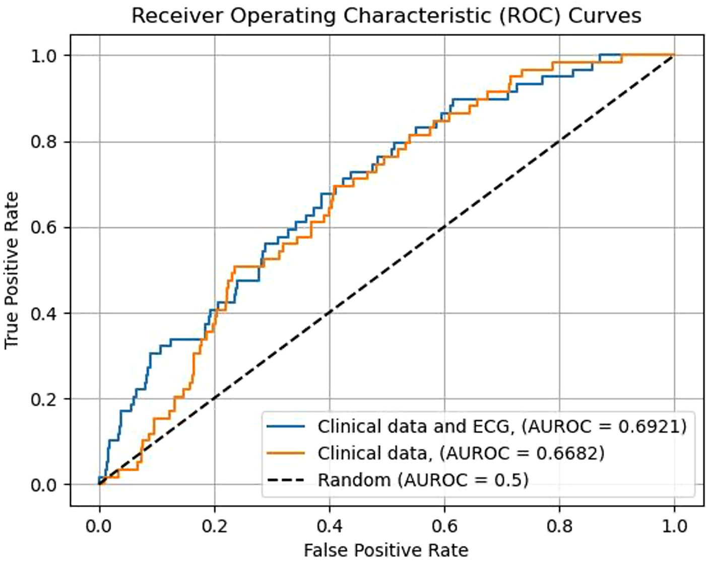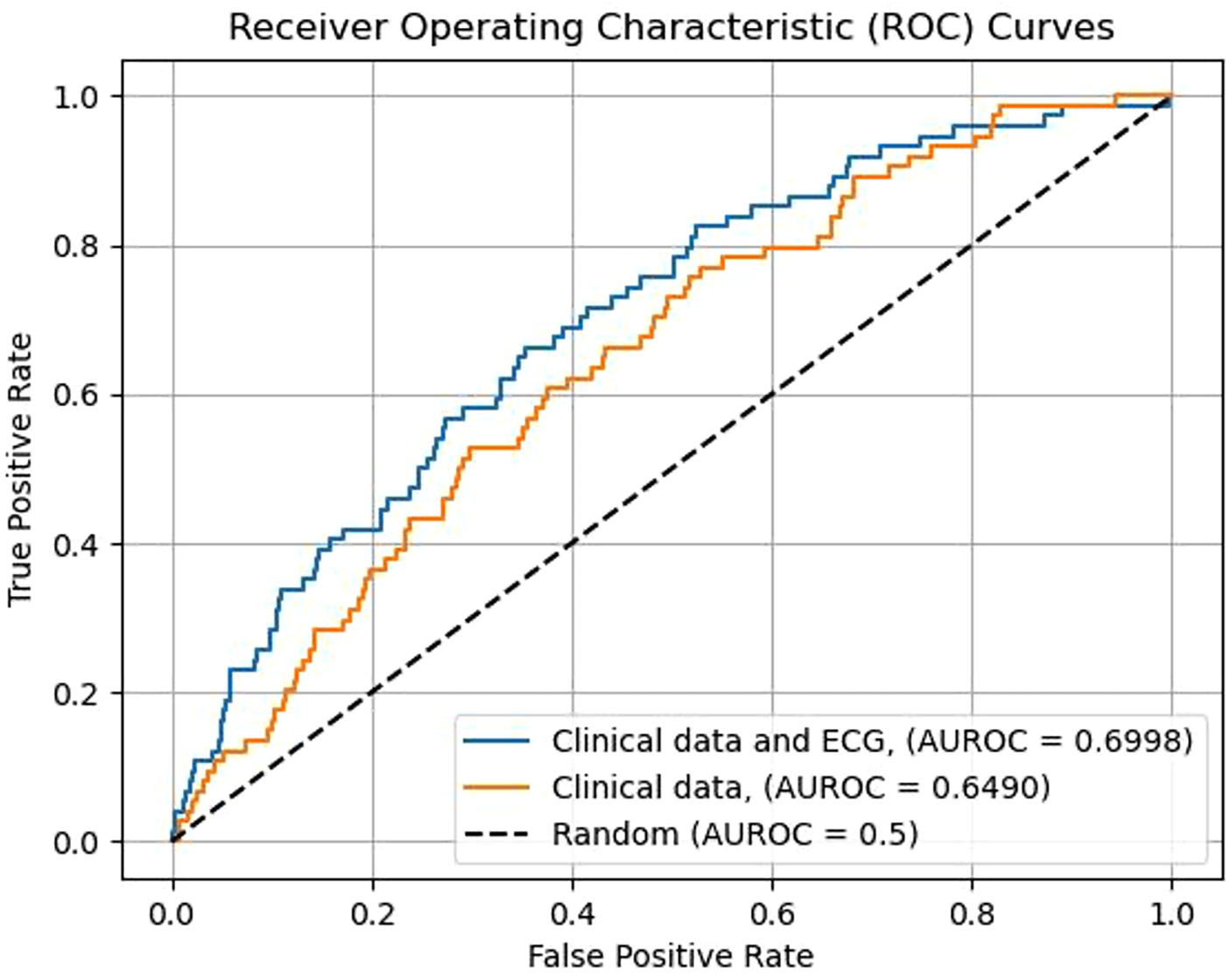 Five-year SCD occurrence rate was 3.3% (n = 287). Regardless of the used ML algorithm, the most significant risk ECG risk features detected by the CIE included known risk features such as QRS duration and factors associated with QRS duration, heart rate–corrected QT time (QTc), and the presence of premature ventricular contractions (PVCs). Risk score formed by using most significant CIE features associated with the risk of SCD despite adjusting for any clinical risk factor (including left ventricular ejection fraction). Sensitivity of CIE data to correctly identify patients with high risk of SCD (over 10% 5-year risk of SCD) was usually low, but specificity and negative prediction value reached up to 96.9% and 97.3% when selecting only the most significant features identified by logistic regression modeling (p-value threshold <0.01 for accepting features in the model). Overall, CIE data showed a modest overall performance for identifying high risk individuals with area under the receiver operating characteristic curve values ranging between 0.652 and 0.693 (highest for extreme gradient boosting and lowest for logistic regression).