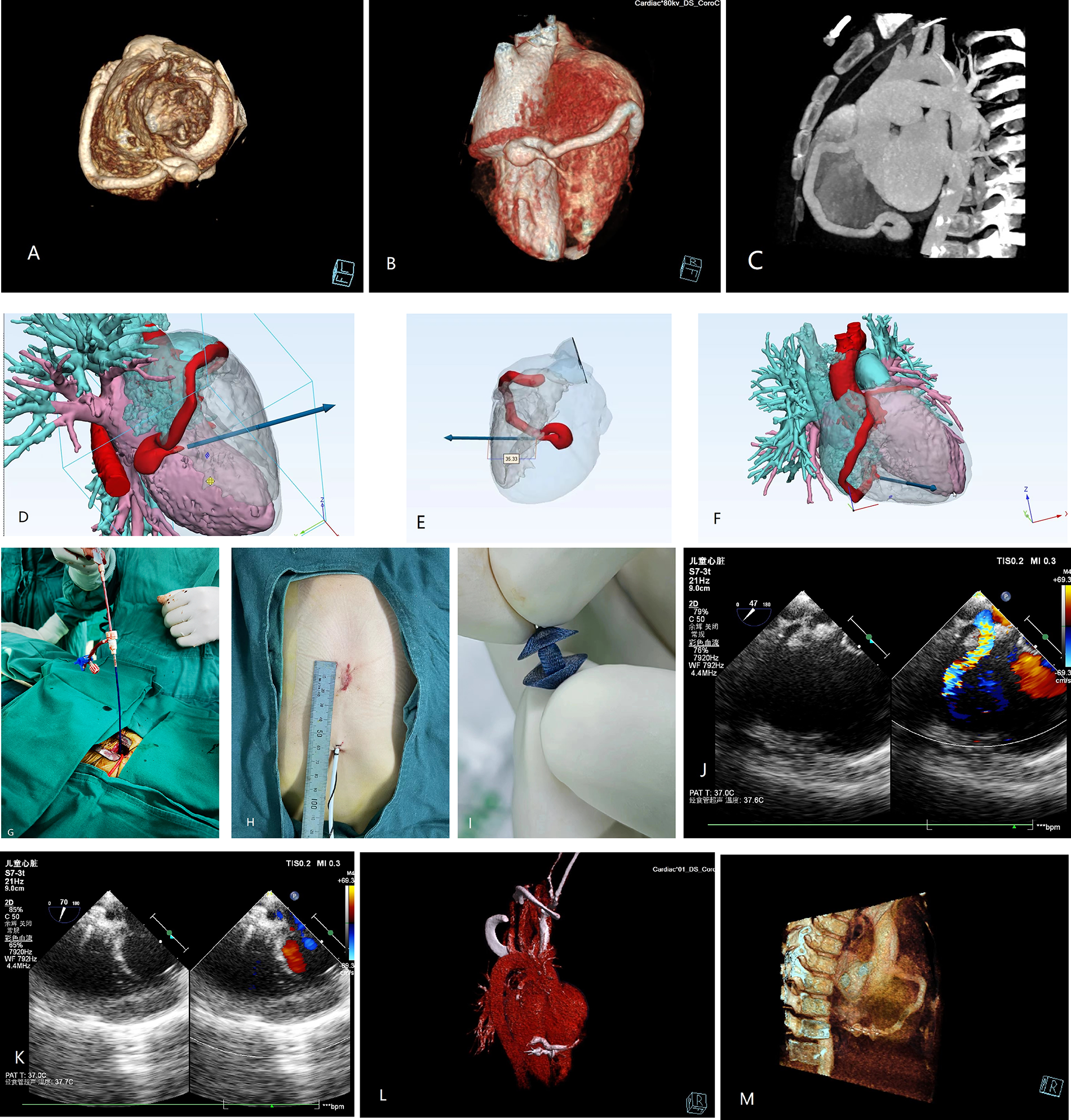 Preoperative 3D (A,B) and 2D (C) computed tomography (CT) images. (D–F) 3D images simulating the fistula drainage position and allowing reverse extrapolation of the puncture site and depth on the right ventricular free wall. (G) Surgical procedure. (H) Access incision. (I) Occluder. (J,K) Intraoperative ultrasound image for identifying the direction of blood flow and determining the direction of sheath guidance. Postoperative 3D (L) and 2D (M) CT images of the successfully occluded coronary artery fistula.