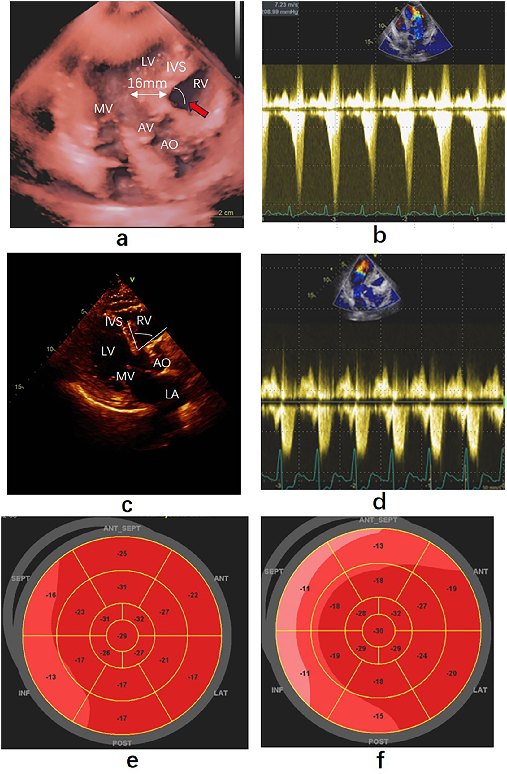 Echocardiography findings before and after precedure. (a) Apical three-chamber view showing the thickness of the base ventricular septum was 16 mm, pointed out by the white double arrow. Red arrow point to the angle between the anterior wall of the aorta and the right ventricular side (b) Left ventricular outflow gradient provoked by dobutamine before ablation. (c) Parasternal long-axis view of echocardiography taken ten months after ablation, the thickness of thebase ventricular septum was 13 mm. White arc was the angle between the anterior wall of the aorta and the right ventricular side. (d) Left ventricular outflow gradient provoked by dobutamine after ablation. (e,f) Strain bullseye plot illustrating regional longitudinal strain in all myocardial segments before and after ablation. RA, right atrium; RV, right ventricle; LV, left ventricle; LA, left atrium; AO, Aorta; AV, aortic valve; MV, mitral valve. SEPT: Posterior Septum, ANT-SEPT: Anterior Septum.