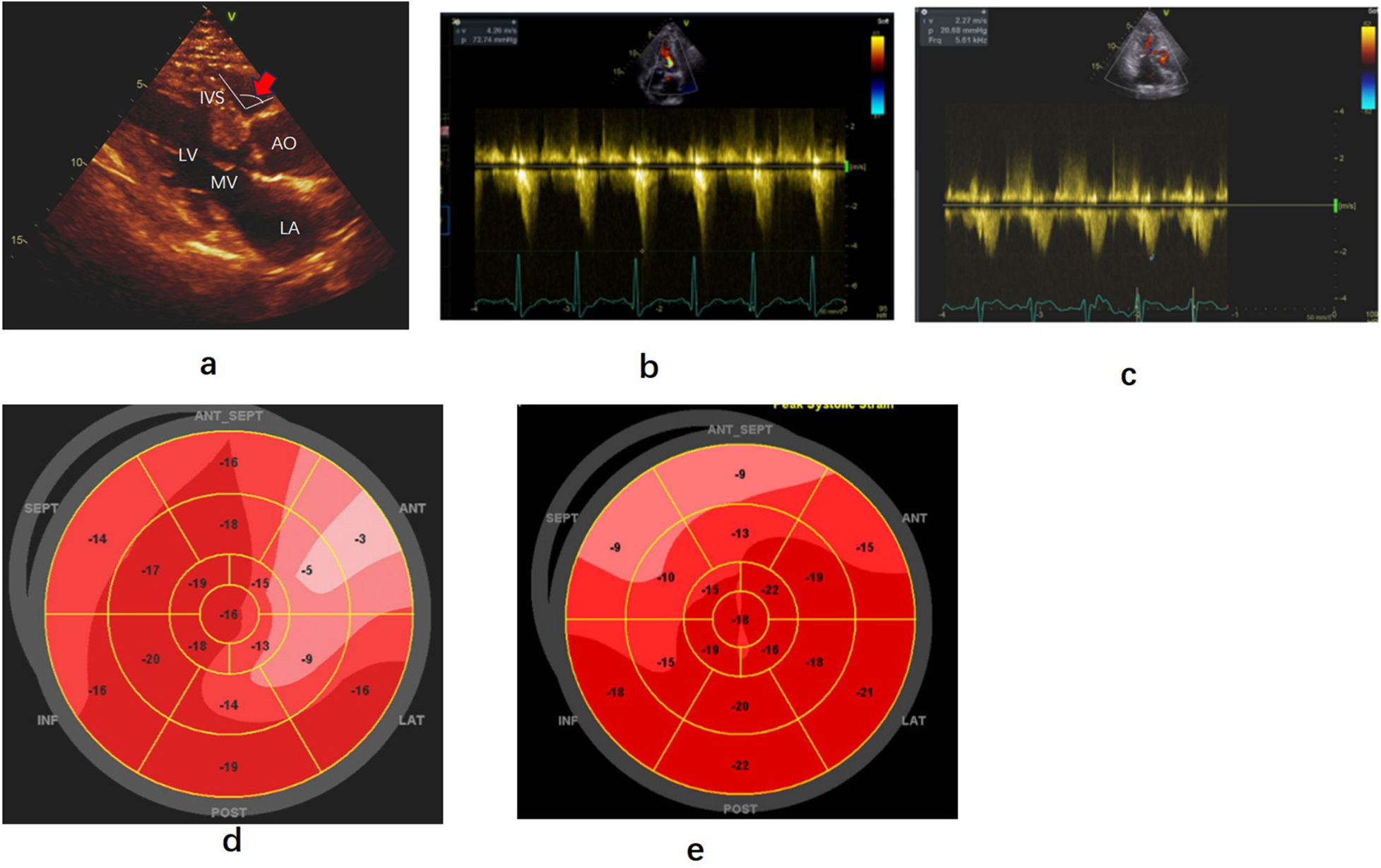 Echocardiography findings before and after precedure. (a) Parasternal long-axis view of echocardiography showing hypertrophy of the base of the left ventricular septum and the angle between the aorta and right ventricular interventricular septum(red arrow). (b,c) Left ventricular outflow gradient provoked by dobutamine before and after radiofrequency ablation. (d,e) Strain bullseye plotsduring baselineand three months after dobutamine stress post-ablation. RA, right atrium; RV, right ventricle; LV, left ventricle; LA, left atrium; AO, Aorta; AV, aortic valve; MV, mitral valve; SEPT, posterior septum; ANT-SEPT, anterior septum.