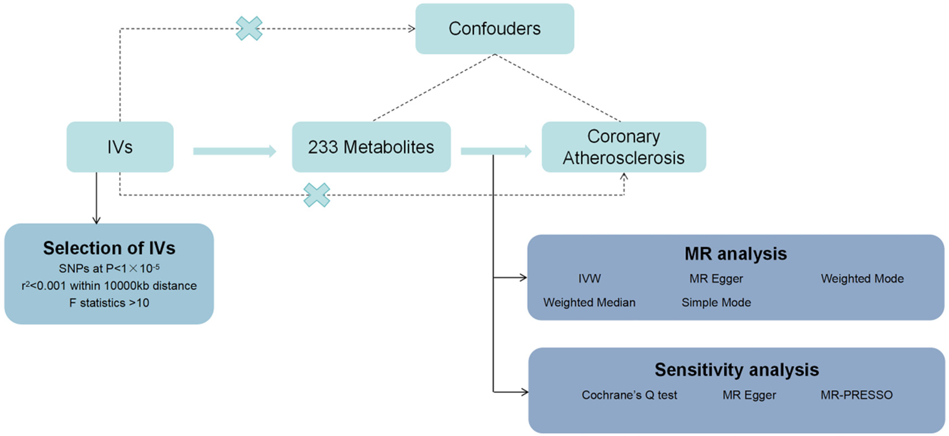 Instrumental variables influence the risk of coronary atherosclerosis solely through the metabolites, without any other pathways.