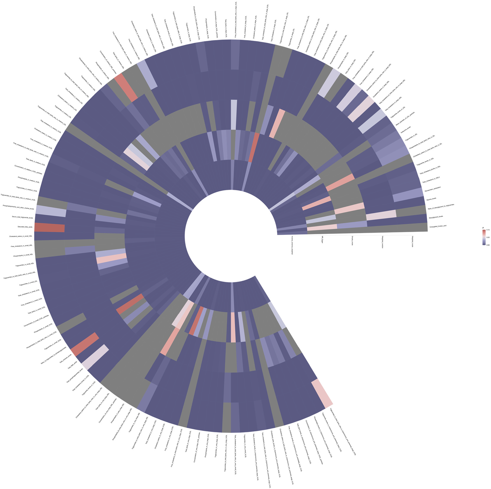 The analysis identified that certain metabolites increase the susceptibility risk of coronary atherosclerosis, including: Total fatty acids (OR = 1.40, 95% CI: 1.28–1.53, P < 0.001), Saturated fatty acids (OR = 1.44, 95% CI: 1.30–1.60, P < 0.001), Serum total triglyceride levels (OR = 1.33, 95% CI: 1.22–1.46, P < 0.001), Conjugated linoleic acid (OR = 1.16, 95% CI: 1.04–1.30, P = 0.007). Conversely, certain metabolites were found to reduce the occurrence of coronary atherosclerosis, such as: Cholesteryl esters to total lipids ratio in medium HDL (OR = 0.73, 95% CI: 0.67–0.78, P < 0.001), Cholesteryl esters to total lipids ratio in large HDL (OR = 0.64, 95% CI: 0.58–0.71, P < 0.001), Total cholesterol to total lipids ratio in medium HDL (OR = 0.71, 95% CI: 0.65–0.77, P < 0.001).