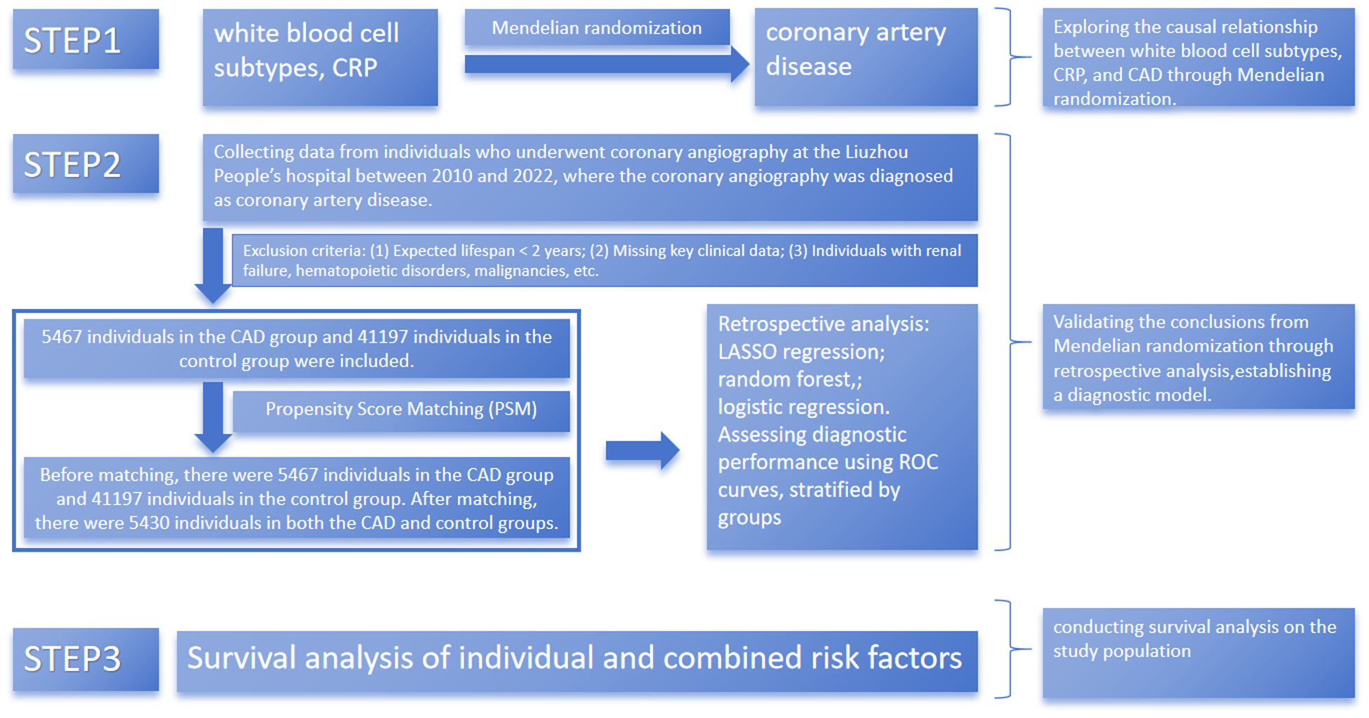 We conducted a Mendelian randomization analysis (MR) on leukocyte subsets, C-reactive protein (CRP) and CAD, incorporating data from 68,624 patients who underwent coronary angiography from 2010 to 2022. After initial screening, clinical data from 46,664 patients were analyzed. Techniques employed included propensity score matching (PSM), logistic regression, lasso regression, and random forest algorithms (RF). Risk factors were assessed, and the sensitivity and specificity of the models were evaluated using receiver operating characteristic (ROC) curves. Additionally, survival analysis was conducted based on a 36-month follow-up period.