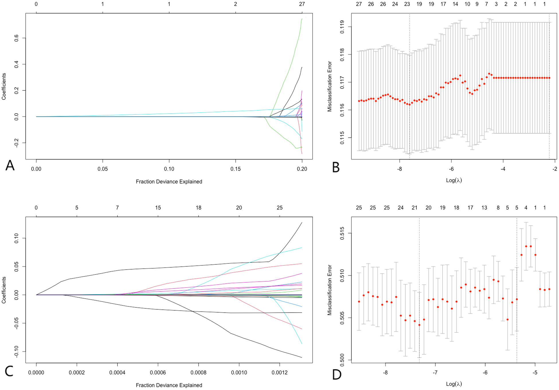 Lasso regression. (A,B) Demonstrate that before PSM, at the optimal lambda value (lambda = −7.61), 23 variables were retained, with variable importance ranking from highest to lowest as CRP, PLT, eosinophil count, percentage of eosinophils, and lymphocyte count, respectively. (C,D) Illustrate that after PSM, at the optimal lambda value (lambda = −7.32), 21 variables were retained, with variable importance ranking from highest to lowest as WBC, CRP, lymphocyte count, eosinophil count, and percentage of eosinophils, respectively. LASSO regression analysis identified CRP and lymphocyte count as significant predictors of CAD, demonstrating their importance in risk prediction.