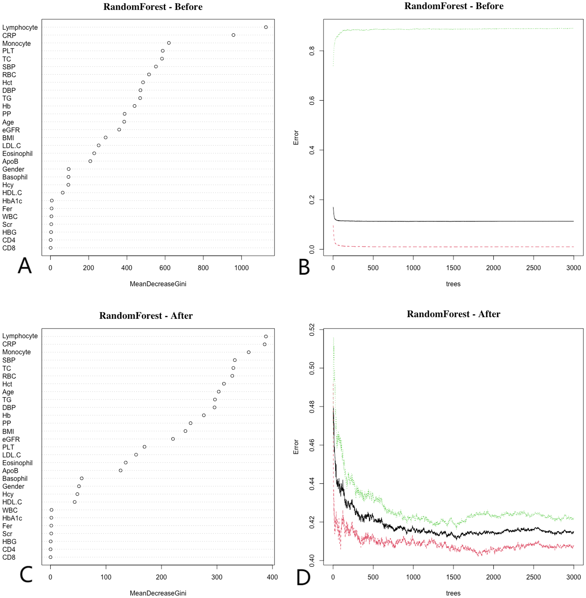 The dependent variable, coronary artery disease (CAD) diagnosis, was dichotomized using a binary categorical variable assignment method, with CAD coded as 1 and non-CAD as 0. A stepwise approach was subsequently applied to incorporate these variables into the logistic regression model. Before matching, the risk factors considered for CAD included age, gender, triglycerides (TG), monocyte count, glomerular filtration rate, total cholesterol (TC), body mass index (BMI), C-reactive protein (CRP), eosinophil percentage, platelets, hemoglobin (Hb), homocysteine (Hcy), high-density lipoprotein cholesterol (HDL-C), low-density lipoprotein cholesterol (LDL-C), pulse pressure (PP), apolipoprotein B (ApoB), and lymphocyte count. After matching, the risk factors for CAD were identified as Hcy, HDL-C, white blood cell count (WBC), age, Hb, BMI, glomerular filtration rate, CRP, lymphocyte count, and red blood cell count (RBC). CRP and lymphocyte count were consistently identified as significant risk factors regardless of matching status. Detailed results are provided in Tables 4, 5.