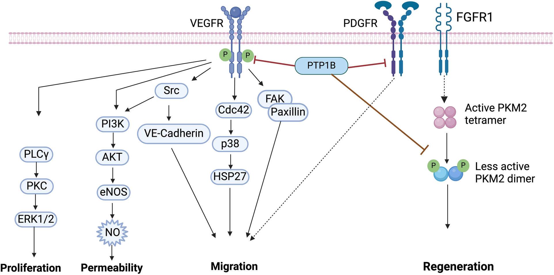 Figure 3. Vascular endothelial growth factor (VEGF) signaling. Binding of VEGF to VEGFR induces its tyrosine phosphorylation, which is followed by the activation of downstream effectors including PLCγ/PKC/ERK1/2, PI3K/AKT, Src, p38 and FAK/Paxillin. PTP1B binds to VEGFR and directly dephosphorylates VEGFR. PTP1B directly binds to platelet-derived growth factor receptor (PDGFR), inducing motility in smooth muscle cells (SMCs). The fibroblast growth factor receptor (FGFR1) directly phosphorylates pyruvate kinase M2 (PKM2), PTP1B dephosphorylates PKM2 and regulates myocyte regeneration. VEGF, vascular endothelial growth factor; PTP1B, protein tyrosine phosphatase 1B; FAK, focal adhesion kinase; PI3K, phosphatidylinositol 3-kinases; eNOS, endothelial nitric oxide synthase; NO, nitric oxide; PLCy, phospho-lipase C gamma; PKC, protein kinase C; ERK1/2, extracellular signal-regulated kinase 1/2; PKM2, pyruvate kinase M2. Image created with BioRender.com.