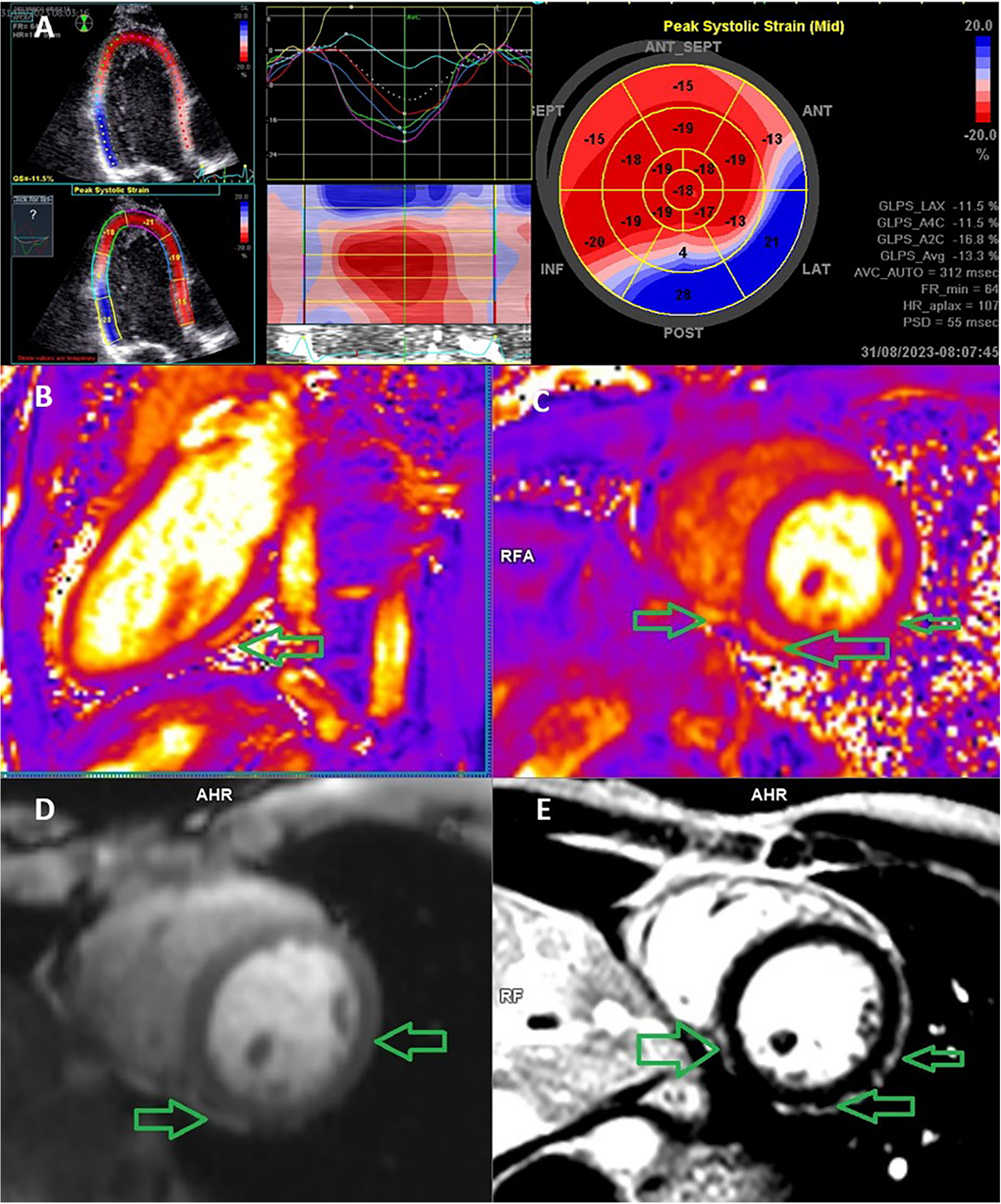 Echocardiography speckle-tracking strain analysis and cardiac MRI in a 17-year-old man with acute perimyocarditis. (A) Speckle-tracking assessment of segmental and global strain on an apical long-axis echocardiography view with a bulls-eye plot of regional longitudinal strain values, which demonstrates impaired strain at the basal inferior and inferolateral wall. The blue segment is dyskinetic, meaning that the wall segment is bulging when it should be contracting. If the left ventricle walls are dyskinetic (i.e., bulging out), the GLS value is positive. (B) Cardiac MRI image demonstrates a T2 relaxometry native dual-chamber scan; the arrow indicates the area of the perimyocardial edema. (C) T2 relaxometry native short axis scan; the arrow indicates the area of the perimyocardial edema. (D) T1 DCE (dynamic contrast enhancement)—early enhancement of the inflammation in the peri-myocardial position of the chamber wall showing an enhancement of the near pericardial layer typical of myocarditis. (E) T1 PSIR postcontrast 15 min, short-axis scan, the arrow indicates the area of peri-myocardial scarring. The left ventricular ejection fraction (global function) was reduced. MRI: magnetic resonance imaging.