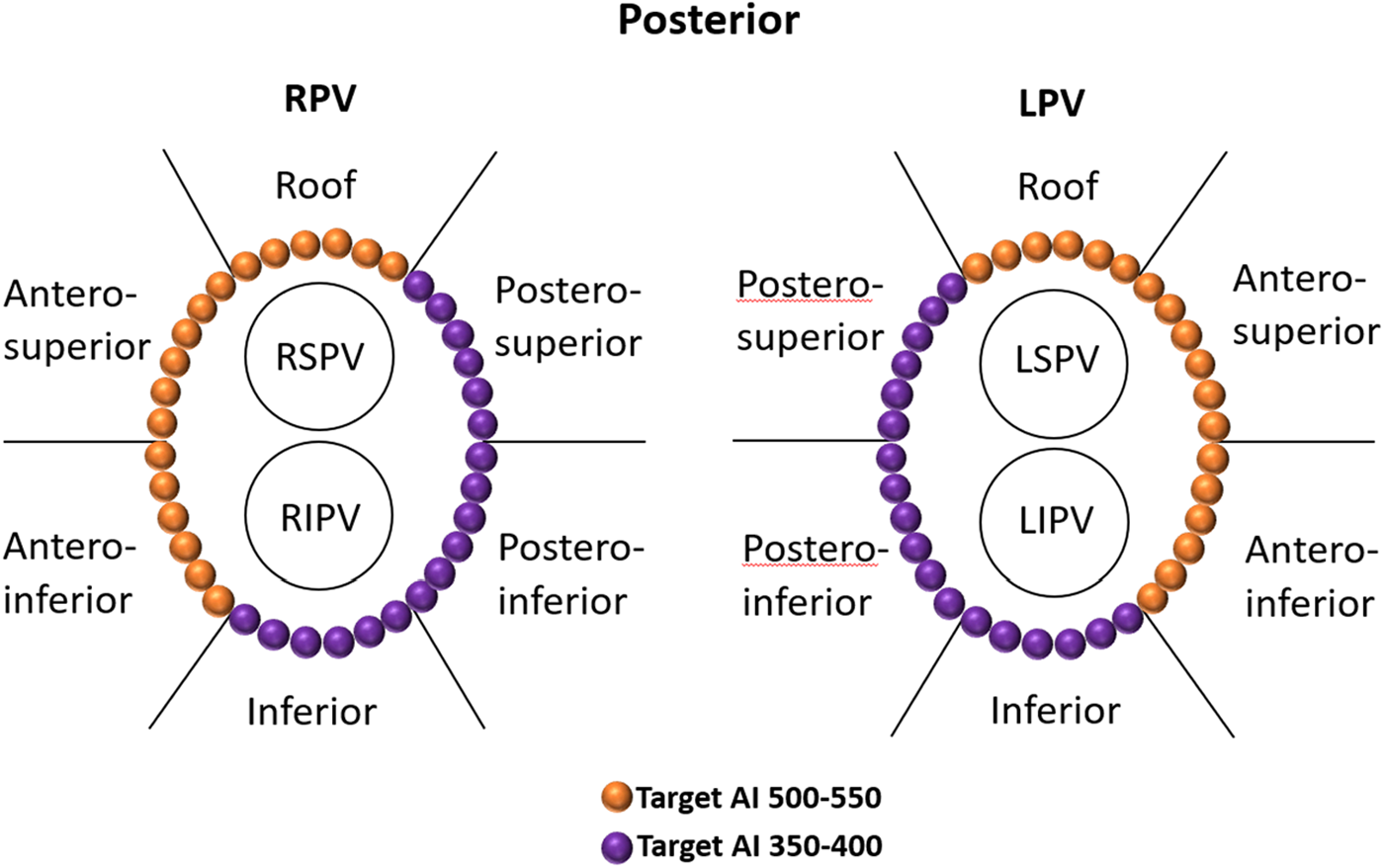 Regional definitions of right and left CCLs and schematic diagrams of target AIs in different regions of CCLs. The target AI values were 500–550 for the roof and anterior walls and 350–400 for the posterior and inferior walls. CCLs, continuous circular lesions; AI, ablation index.