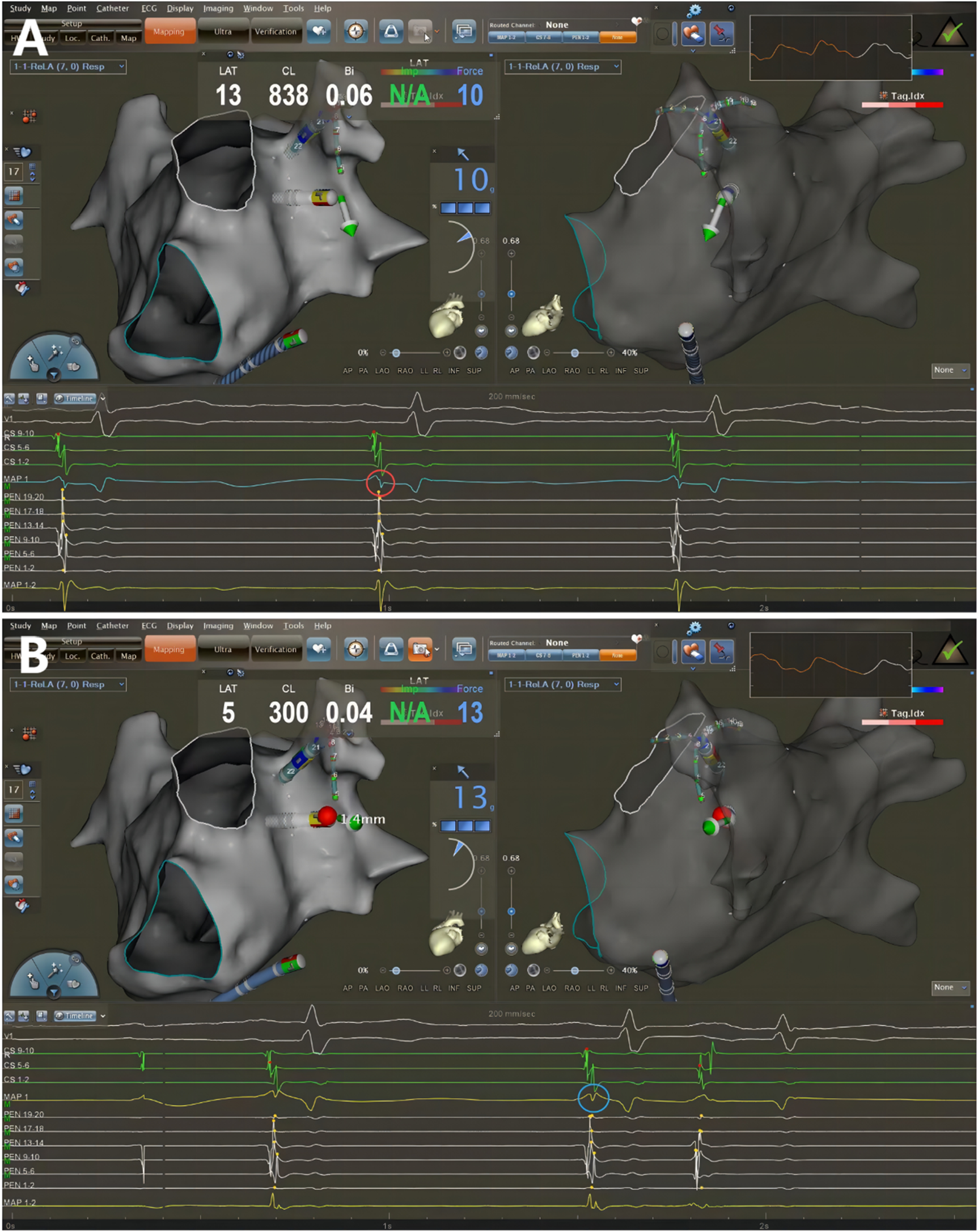Catheter ablation guided by AI combined with UP-EGM. Every point in the CCLs was ablated following CLOSE protocol. The UP-EGM for every ablation point was also recorded for comparison. (A) Before ablation, the UP-EGM of the point showed a negative component, Rs pattern (in the red circle). (B) After ablation, UP-EGMs became completely positive, rsr pattern (in the blue circle). AI, ablation Index; UP-EGM, unipolar electrogram; CCLs, continuous circular lesions.