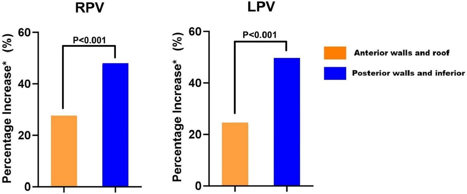 Comparison of percentage increase between anterior and posterior walls in RPV and LPV. Percentage increase* indicates the rate of increase from AIEND to AIUP-EGM. RPV, right pulmonary vein; LPV, left pulmonary vein.