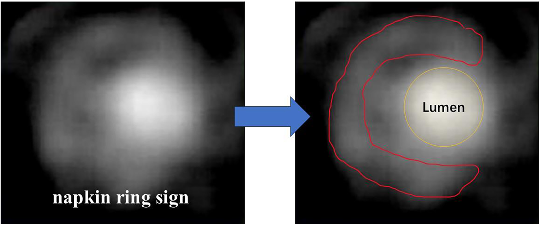 Typical images of napkin ring sign. Lumen contour (yellow line) and fibrous tissue contour (red line) are shown.