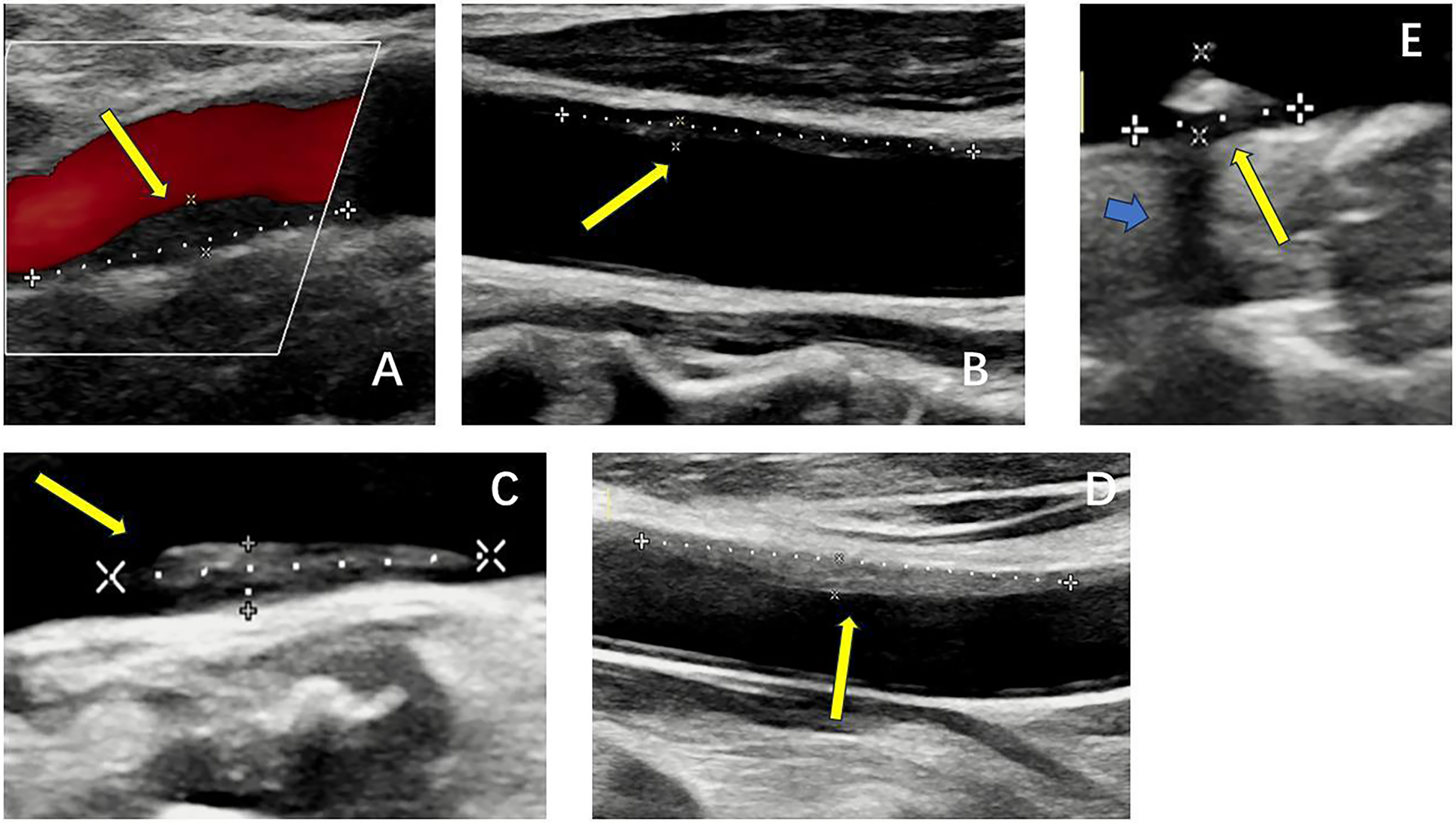 B-mode ultrasound images of five types of plaques distinguished by the gray-weale–nicolaides (GWN) classification including (A) uniformly echolucent plaque, (B) predominately echolucent plaque, (C) predominantly echogenic plaque, (D) uniformly echogenic plaque, and (E) heavy calcification. The yellow arrows indicate plaques. The blue arrow indicates the shadow.