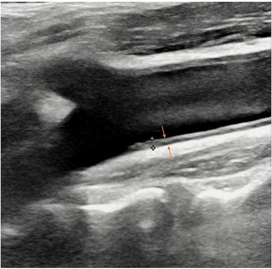 B-mode ultrasound image of carotid intima-media thickness (IMT) (arrows).