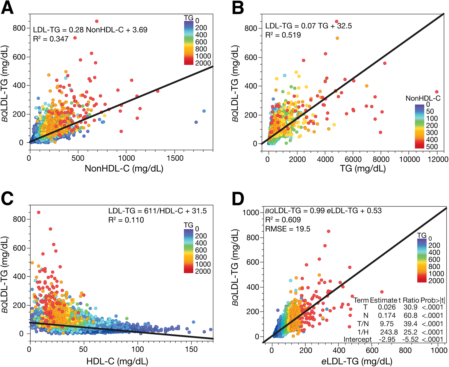 Correlation of BQLDL-TG with lipid parameters and validation of eLDL-TG equation. Relationship between LDL-TG measured by the BQ reference method (BQLDL-TG) (N = 40,202) and nonHDL-C (Panel A), TG (Panel B), and HDL-C (Panel C). Development of the equation for estimated LDL-TG (eLDL-TG) (Panel D). Equation parameters are from the training dataset (N = 20,191) and graphed results are from the validation dataset (N = 20,011). Results are colored by TG (Panels A, C, and D) and nonHDL-C (B).