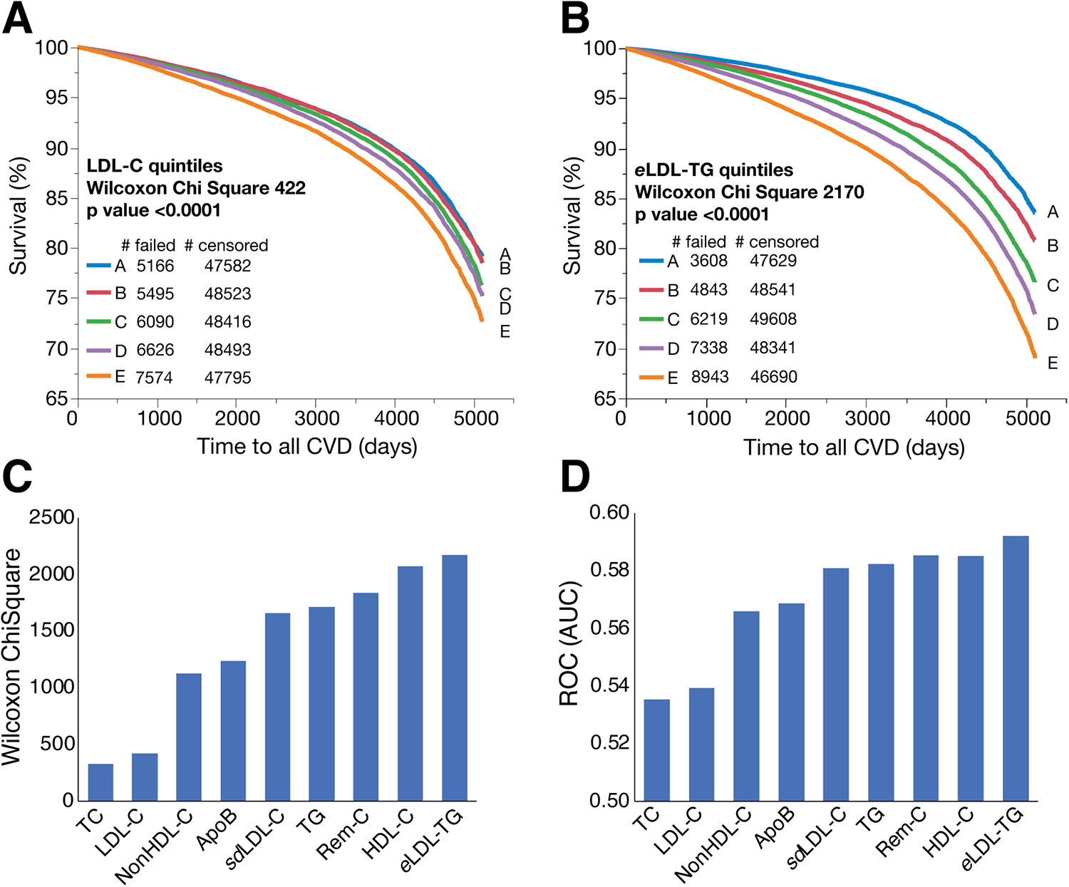 Kaplan-Meier survival curves and lipid test evaluation for ASCVD events in the UKB dataset. Kaplan-Meier survival curves in the UKB dataset for people without any lipid medications or incomplete follow-up data (N = 271,760) for all ASCVD events were calculated for LDL-C quintiles (Panel A) and eLDL-TG quintiles (Panel B). Other lipid tests were divided into quintiles for survival curves and the Wilcoxon Chi-Square is ranked (Panel C). The same set of lipid tests was evaluated with logistic regression for ASCVD and the AUC is ranked (Panel D).