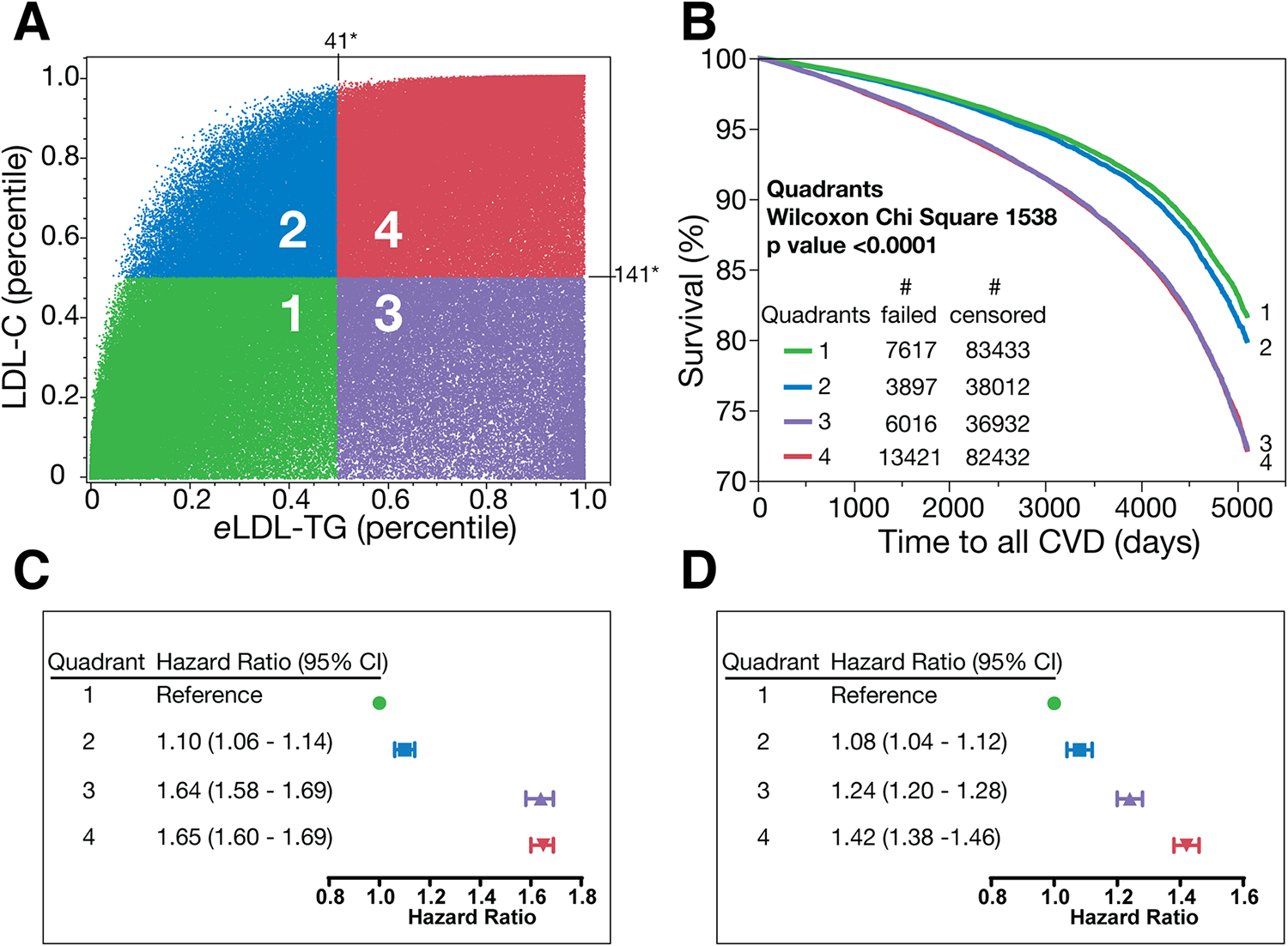 Discordance analysis and survival curves in the UKB dataset. Discordance analysis in UKB dataset for people without any lipid medications or missing follow-up data (N = 271,760). The percentile of LDL-C is plotted against the percentile of eLDL-TG and divided into quadrants (1-green, 2-blue, 3-purple, 4-red (Panel A) and Kaplan-Meier survival curves between these four quadrants are plotted in Panel B. Panel C shows unadjusted model for the ASCVD incidents per quadrants. Panel D shows model for the ASCVD incidents adjusted for nonlipid variables: age, sex, race, SPB, antihypertensive medication, diabetes, and smoking. * (Panel A) is concentration in mg/dl of the 50th percentile.