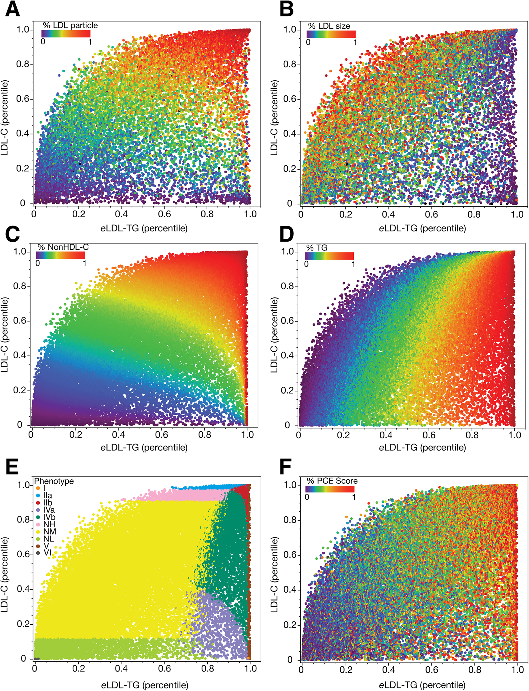 Percentile relationships between eLDL-TG and LDL-C in the NIH and NHANES datasets. Data is plotted as percentiles for eLDL-TG and LDL-C in an NIH dataset of NMR lipoprotein results (N = 13,793, Panels A, B). Results are colored by LDL particle number as a percentile (Panel A) and average LDL size as a percentile (Panel B). Data is plotted as percentiles for eLDL-TG and S-LDL-C in NHANES (Panels C–F). Results are colored by percentiles of nonHDL-C (Panel C), percentiles of TG (Panel D), lipoprotein phenotypes, according to the Sampson classification system (Panel E), and the pooled cohort equations (PCE) calculated as if all patients were 55-year old White males and expressed in percentiles (Panel F).