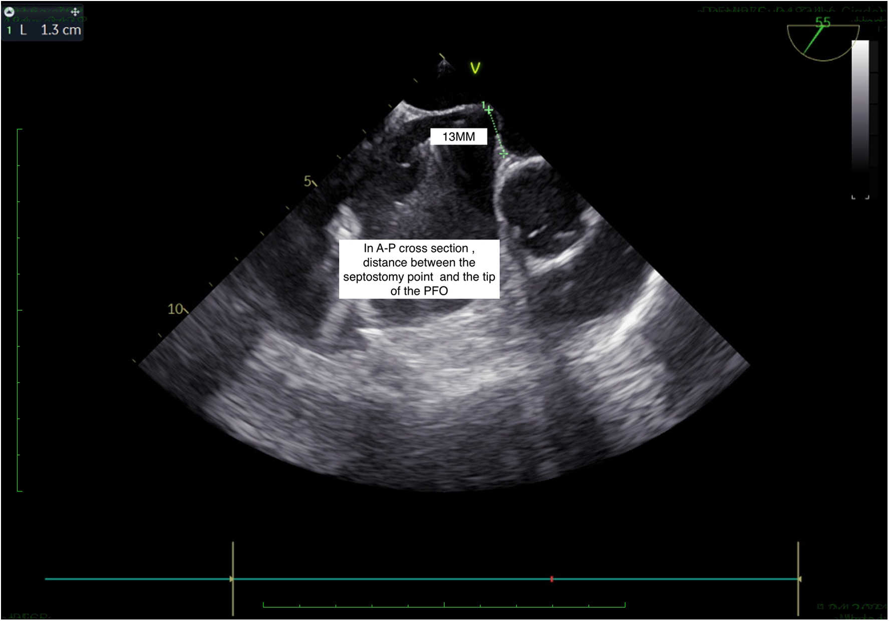 (A) When the septostomy point was placed lower (9 mm), the correct device selection was made possible without increasing the device size. If the device had been selected by taking images from a single section (A-P), a too-small device would have been selected and a residual shunt would have been left. (B) In the anterior-posterior section, the distance between the septostomy point and the tip of the PFO is 8 mm. (C) In the bicaval section of the same patient, this distance is 13 mm.