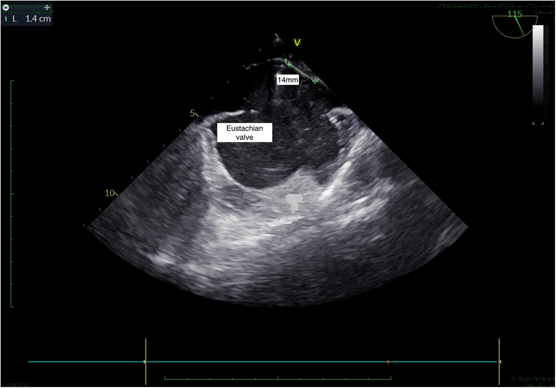 TEE, bicaval view: presence of Eustachian valve and PFO.
