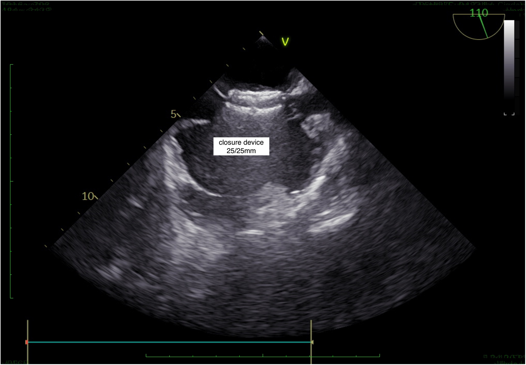 A long introducer sheath was then inserted over the wire and the device was placed using the standard technique. First, the left side disc was released and the whole system was pulled back till the left atrial disc contacted the septum, and then the right atrial disc was released.