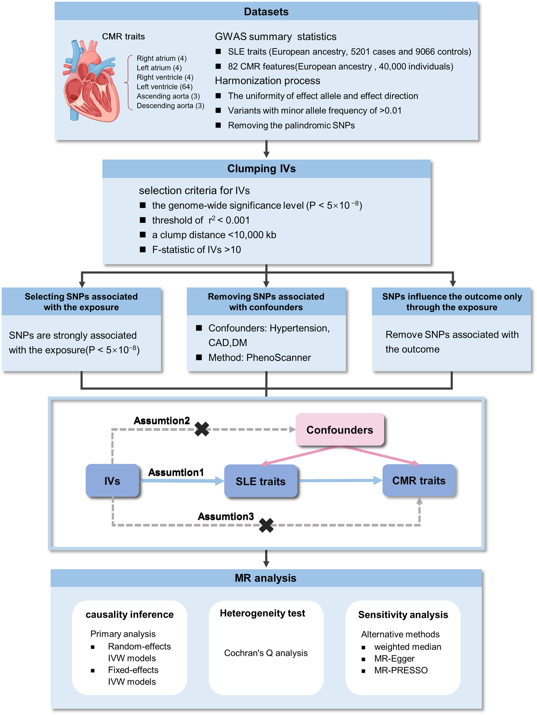Overview of the study design and analyses. CMR, cardiovascular magnetic resonance imaging; GWAS, genome-wide association studies; SLE, systemic lupus erythematosus; SNPs, single nucleotide polymorphisms; IVW, inverse-variance weighted; IVs, instrumental variables.