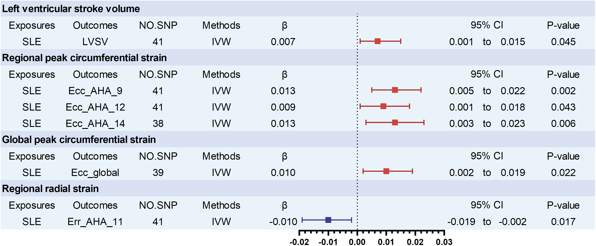 Significant associations of genetically predicted SLE traits with cardiovascular magnetic resonance imaging traits. LVSV, left ventricular stroke volume; Ecc_AHA, regional peak circumferential strain, segments 9, 12, and 14 of the 16 predefined segments by the American Heart Association (AHA); Ecc_global, global peak circumferential strain. Err_AHA, regional radial strain, segment 11 of the 16 predefined segments by the American Heart Association (AHA); SLE, systemic lupus erythematosus.
