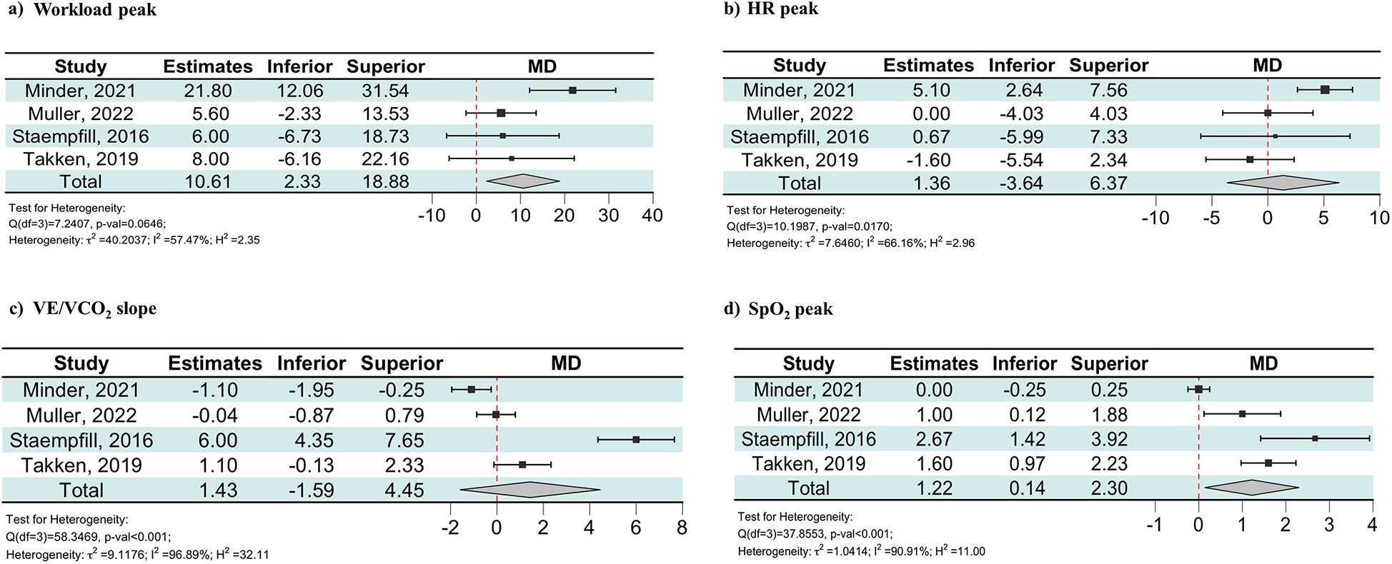 The continuous variables were reported as means with standard deviations (SDs). When data were reported as the median and interquartile range (IQR), means and SDs were approximately estimated by the method described by Wan et al. (16) Heterogeneity among the studies was assessed using Cochran's Q test and the I-squared statistic. As such, a random-effects model was applied to estimate the pooled effect size and its 95% confidence interval. Pooled estimates were obtained using the mean difference (MD) in the change scores of the CPET parameters of the healthy controls and the CHD group. The change scores were calculated as the difference in each CPET parameter between LA and HA. A subgroup analysis was also specifically performed for patients with Fontan circulation as the most representative sample. Any parameters not common to all studies were not meta-analyzed. The results are shown in forest plots, with 95% confidence intervals. The online tool MA-cont was used for the meta-analysis (17, 18).