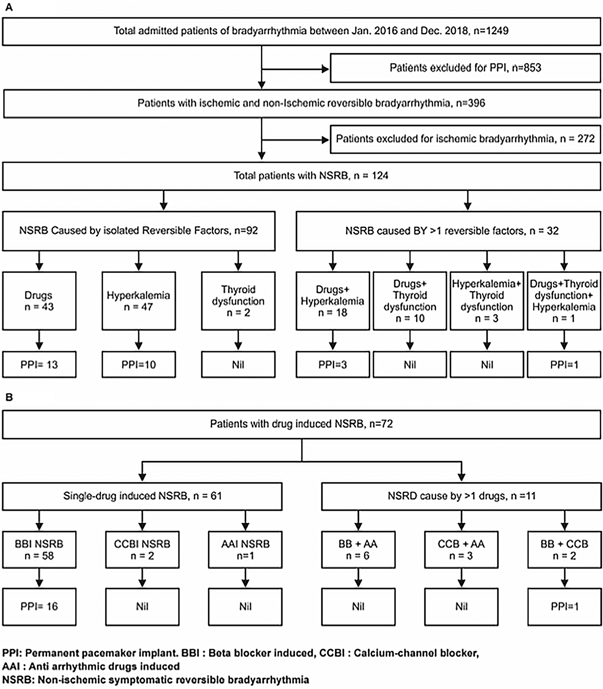 (A) Study design and outcomes in patients with patients with non-ischemic symptomatic reversible bradyarrhythmia. (B) Outcomes in patients with drug-induced symptomatic reversible bradyarrhythmia.