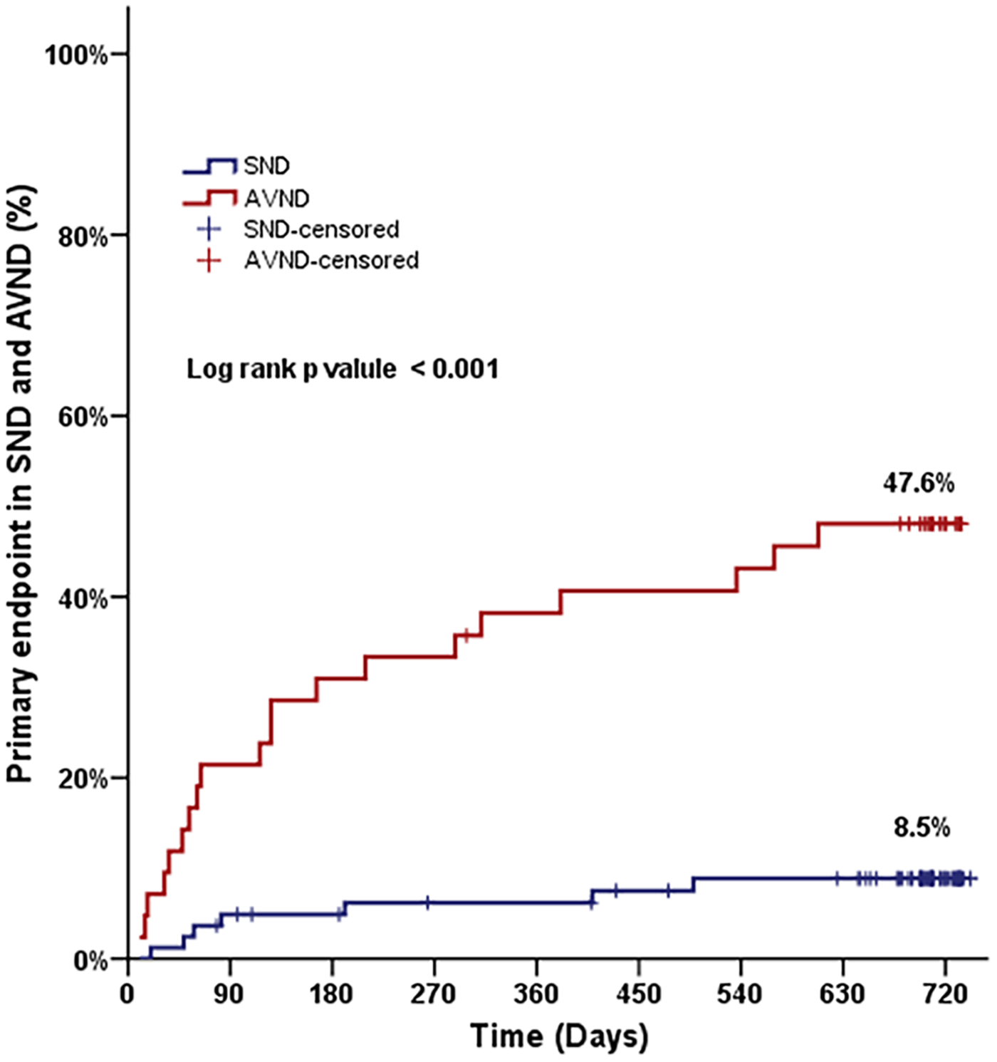 A total of 27 patients (21.8%) required permanent pacing for recurrence of bradyarrhythmia, over a median follow-up of 700 (range, 10–742) days. None of these patients had an attributable cause for bradycardia at the time of recurrence (Figures 1A,B). Among the patients experiencing recurrence, 18 (14.5%) developed symptomatic advanced AV block. Advanced AV block was detected in seven patients (5.6%) during routine follow-up examinations. Additionally, two patients (1.6%) presented with symptomatic sinus pauses exceeding 3 s in duration. The median time to recurrence requiring permanent pacing was 4 months, and more than half of these patients (17 out of 27; 63.0%) reached the primary endpoint within the first 6 months. When compared to the SND group, more patients in the AVND group (74.1% vs. 25.9%, p ≤ 0.001) needed permanent pacing (Figure 2).