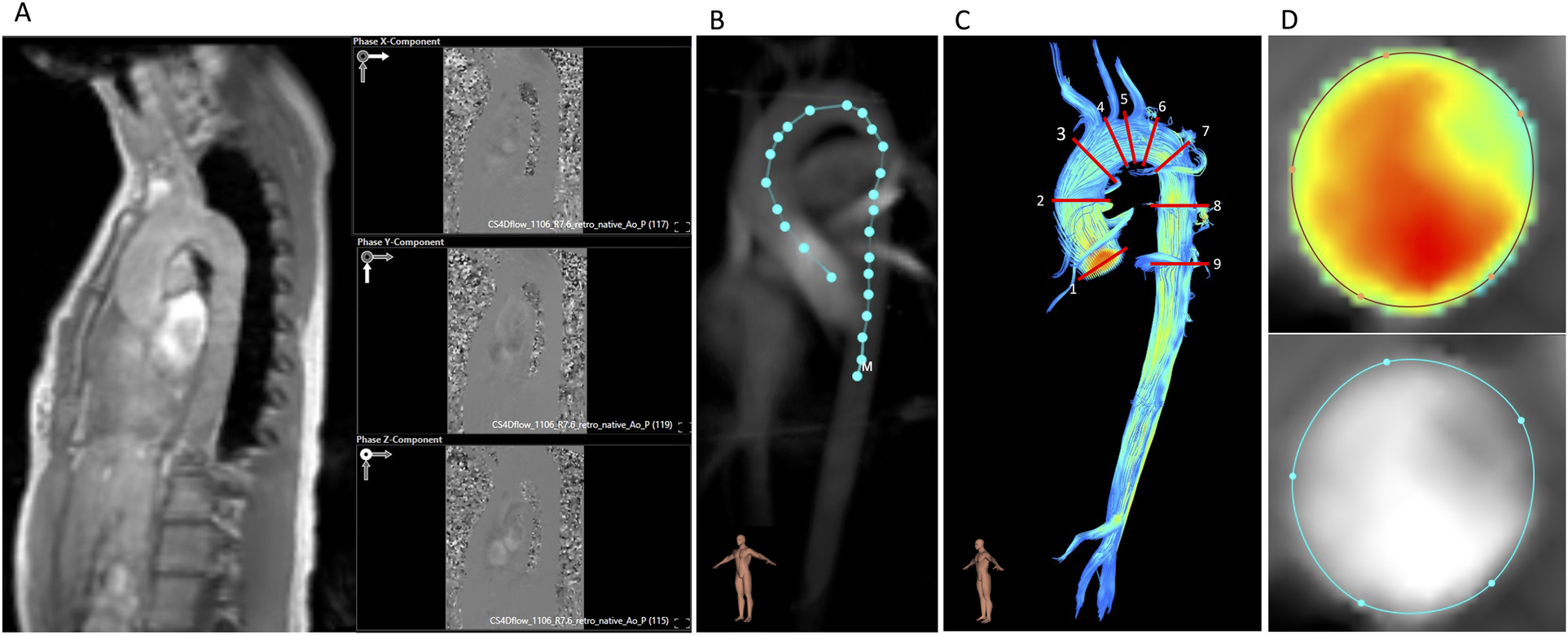 Postprocessing of 4D flow CMR. (A) Magnitude image and the three affiliated phase encoding images (x, y, z). (B) Vessel centerline placement along the thoracic aorta. (C) Positions of the nine analysis planes. (D) Velocity masks and magnitude images for correction of lumen contour segmentation in every cardiac phase.