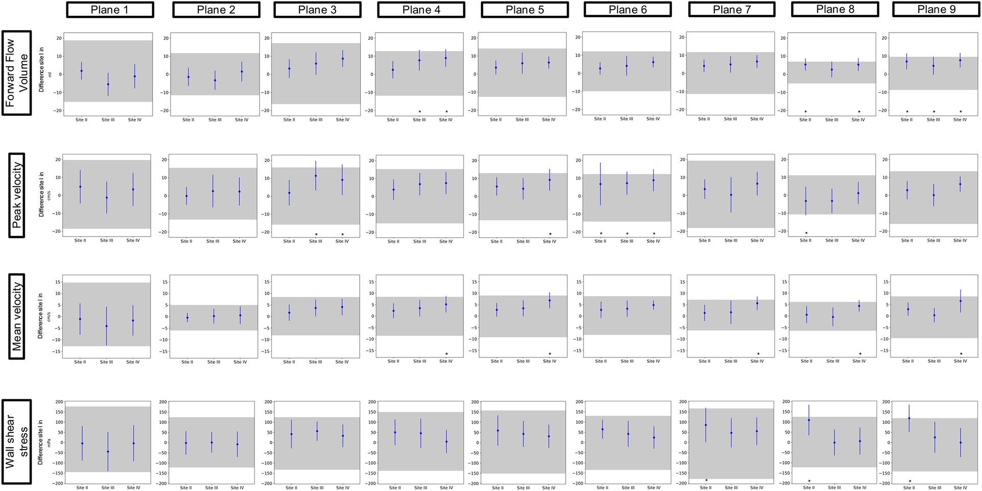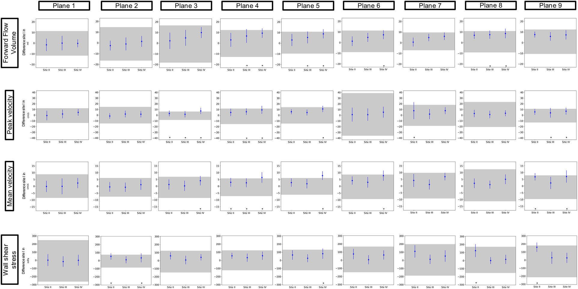 Inter-site comparison for the 4D flow CMR whole heart protocol. The grayish area represents the means and 95% tolerance ranges of both scans before and after repositioning at study Site I serving as a reference for the site comparison. The results of the individual sites are represented by the mean deviation with a 95% confidence interval (blue lines with dots). If these were within the tolerance ranges equivalence was assumed. Exceeded tolerance ranges are indicated by *.