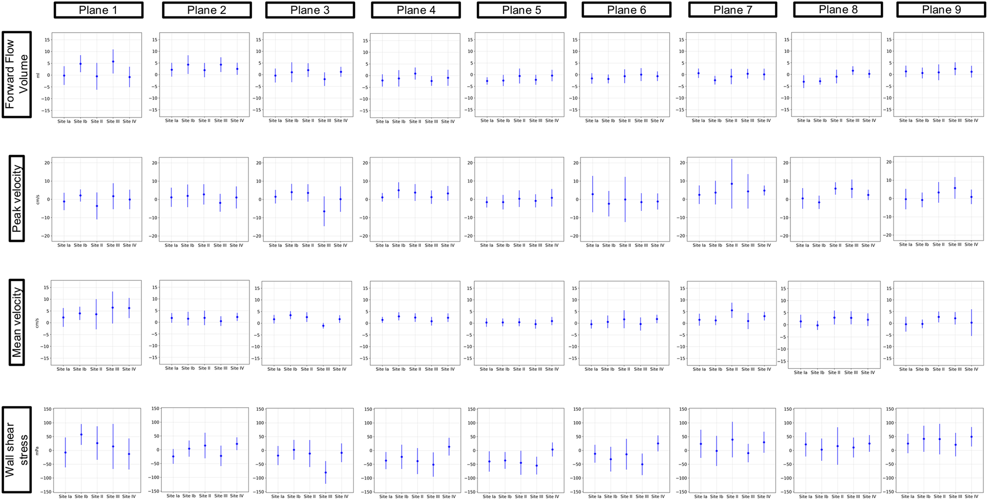 Inter-site comparability showed equivalency in P1 and P2 for FFV, Vp, and Vm at all sites. Non-equivalency was present in various planes of P3–P9 and in P2 for 3D WSS in one protocol. In total, Site IV showed the most disagreements. Protocol comparison yielded excellent (>0.9) ICC in every plane for FFV, good (0.75–0.9) to excellent ICC for Vm and 3D WSS, good to excellent ICC in eight planes for Vp, and moderate (0.5–0.75) ICC in one plane for Vp. Inter- and intra-observer analysis showed excellent agreement for every parameter.