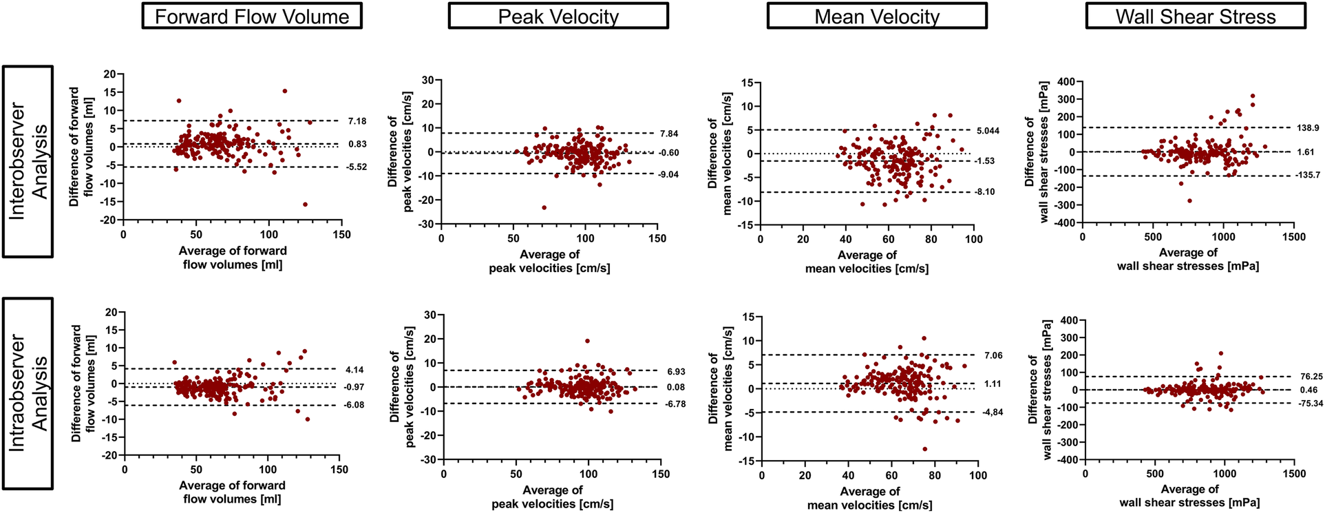 | Parameter | Forward flow volume (mL) | Peak velocity (cm/s) | Mean velocity (cm/s) | 3D wall shear stress (mPa) |