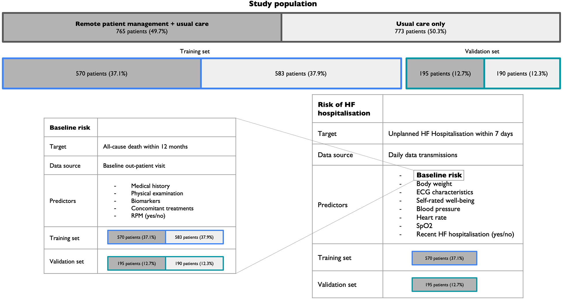 For model development and validation in this current study, we used all patients of the full analysis set as defined in the TIM-HF2 trial. The final dataset contained 773 patients assigned to usual care, and 765 patients assigned to RPM + usual care.