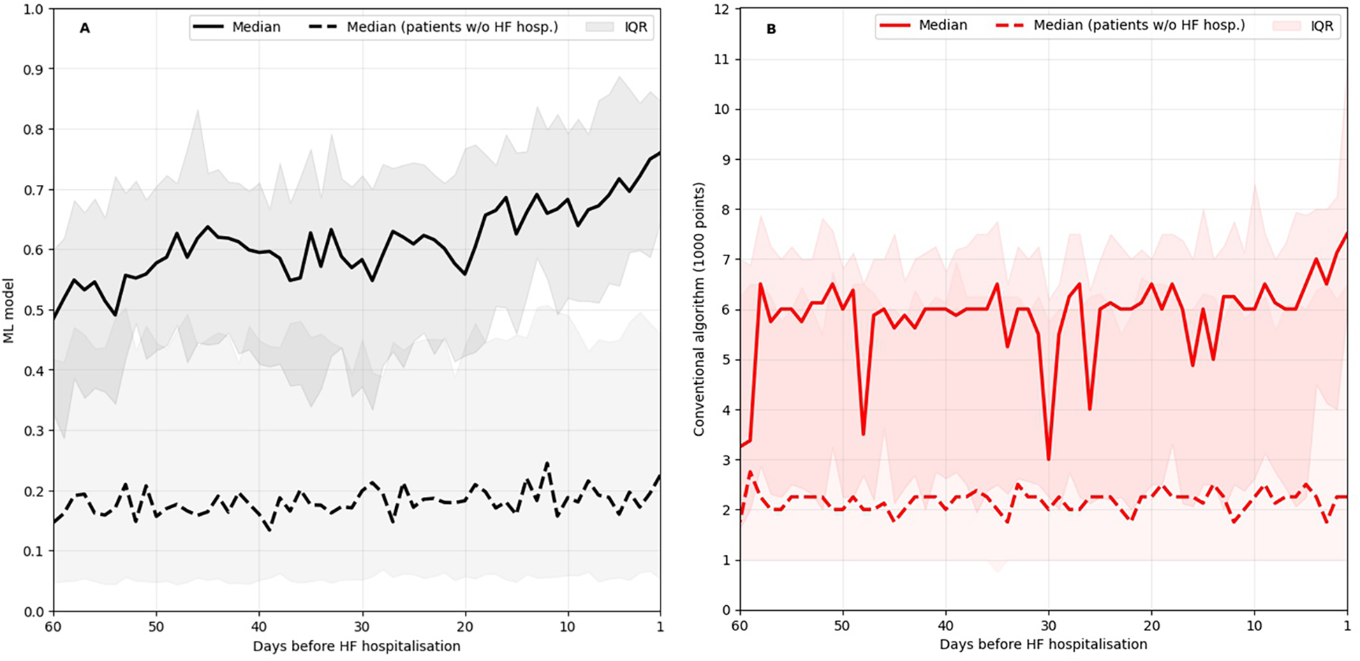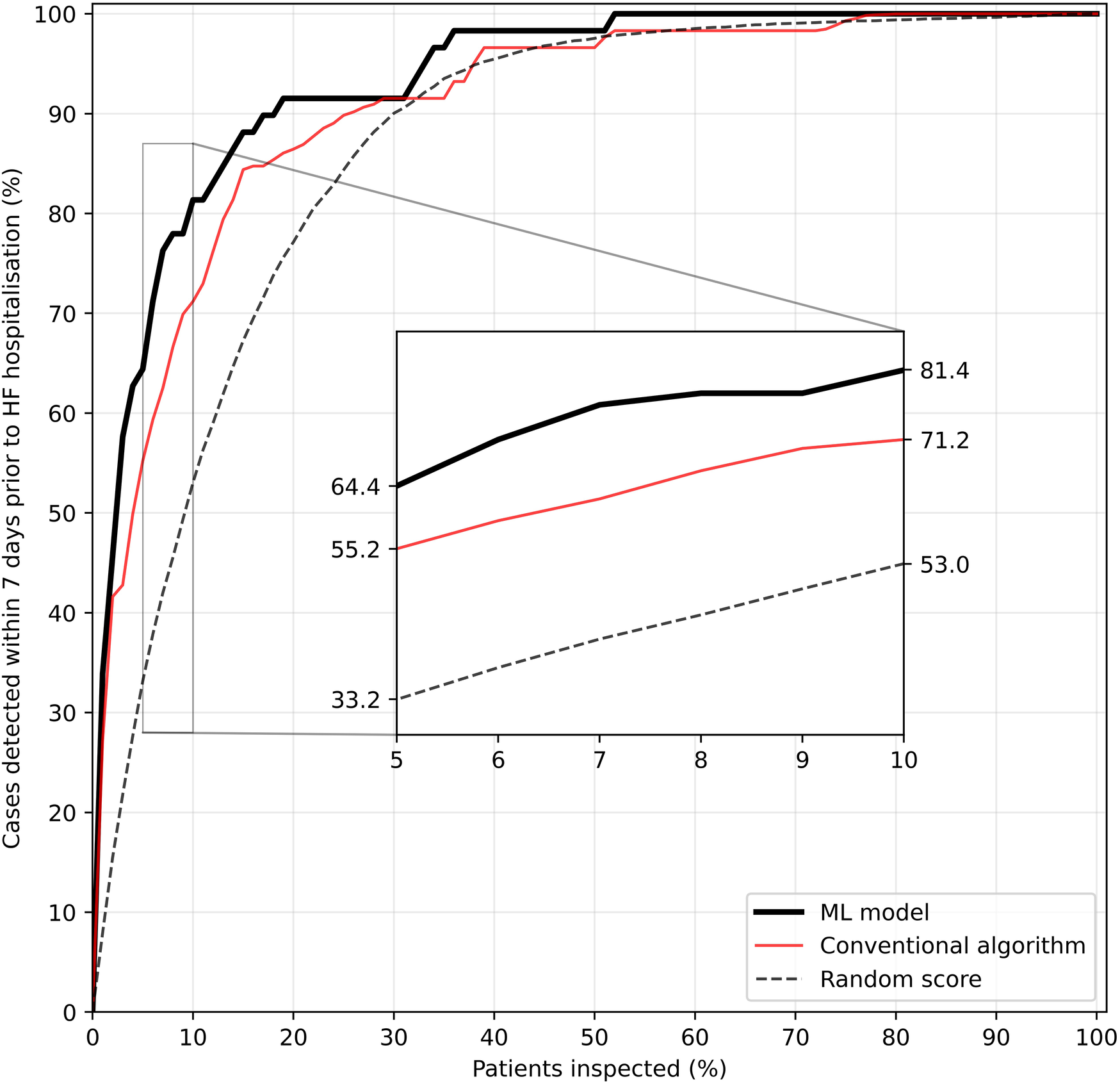 The machine learning model significantly outperformed the conventional algorithm (ROCAUC 0.855 vs. 0.727, p < 0.001). On average, the machine learning risk score increased continuously in the three weeks preceding heart failure hospitalisations, indicating potential for early detection of risk. In a simulated one-year scenario, daily review of only the one third of patients with the highest machine learning risk score would have led to detection of 95% of HF hospitalisations occurring within the following seven days.