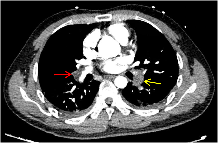 CTPA shows multiple pulmonary artery-filling defects in both lungs. The red arrow represents the main trunk of the right pulmonary artery, and the yellow arrow represents the lower left pulmonary artery.