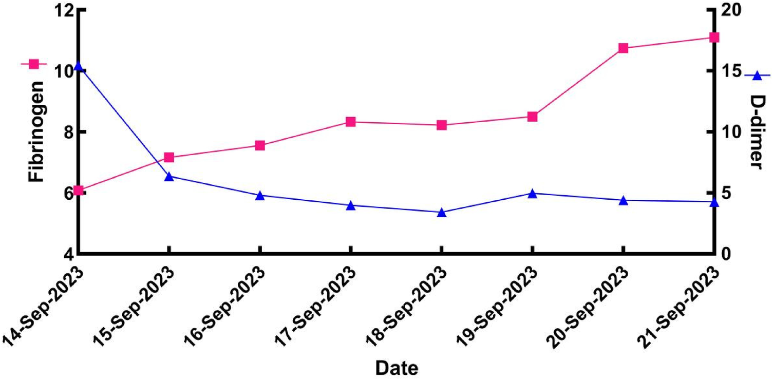 Fibrinogen and D-dimer levels of patients during ICU treatment.