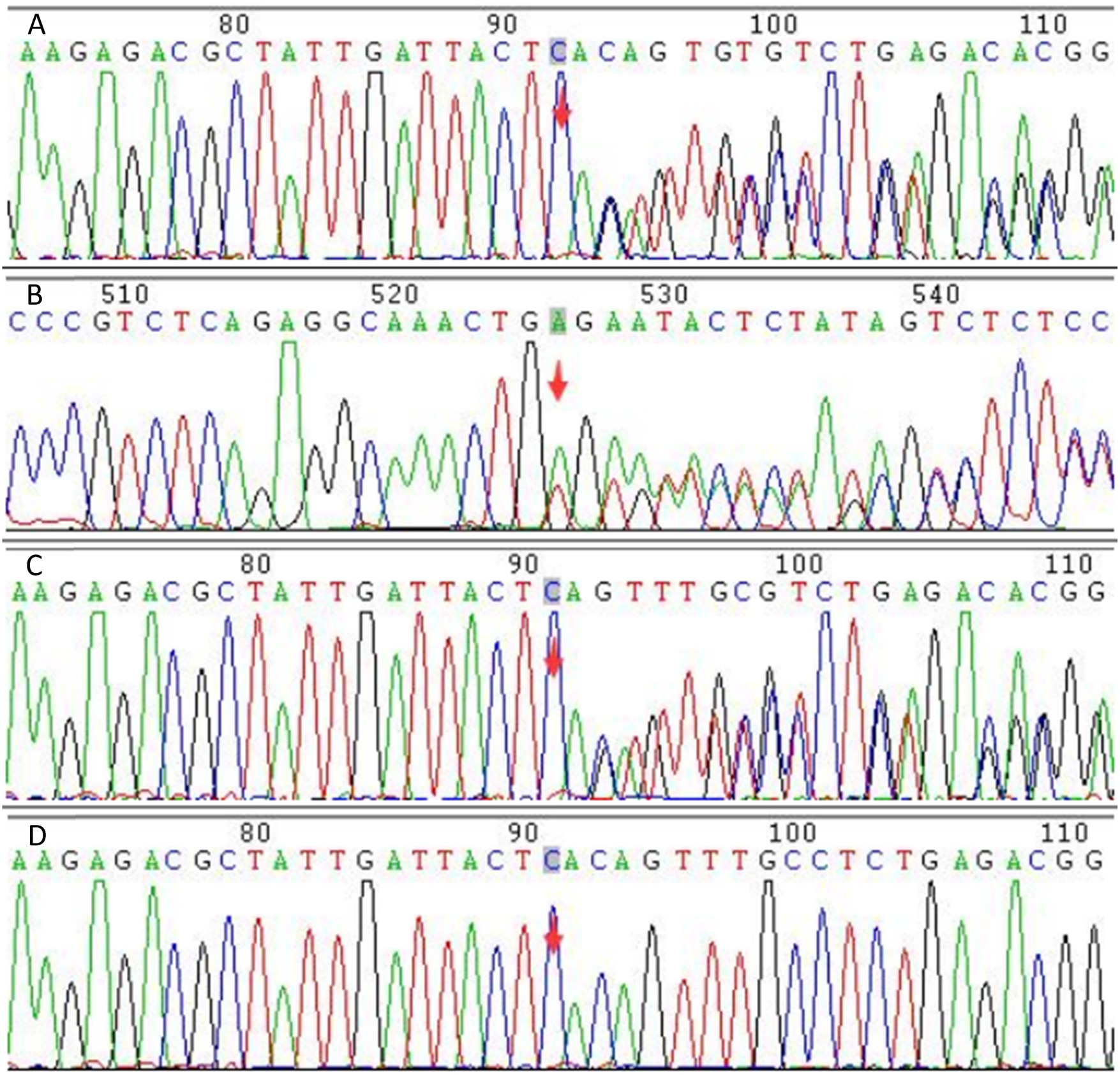 Figure 3 shows the Sanger sequencing results for the patient and their parents. (A) shows the forward sequencing of the patient's gene, (B) the reverse sequencing, (C) the forward sequencing of the father's gene, and (D) the forward sequencing of the mother's gene. The red arrow marks the mutation site. The sequence diagrams to the right of the arrow show a bimodal pattern in both the patient and the father, while the mother's sequence is unimodal. This indicates that the c.76+2_76+3del mutation, present in both the patient and the father, is a base deletion in the splicing donor region of the PROS1 gene. This mutation is predicted to cause mRNA splicing abnormalities.